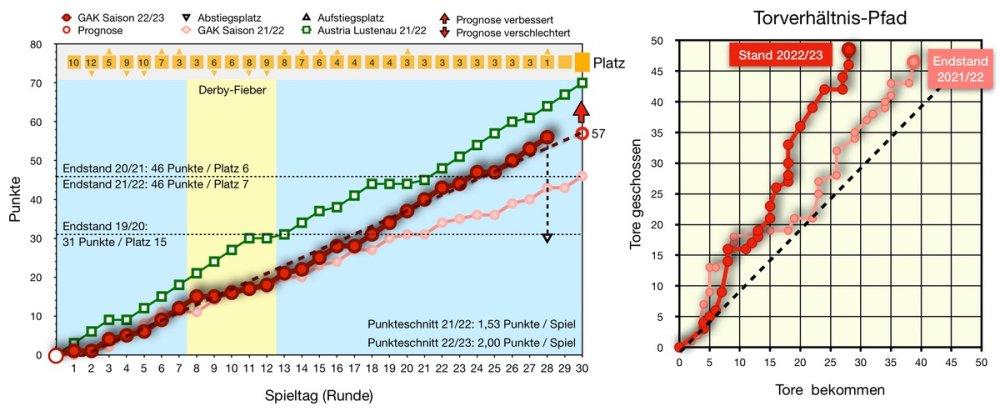 Dieses Wochenende hat mich wirklich sehr viel Nerven gekostet, aber natürlich in positiver Weise. Ich glaube, die nächsten 2 Wochen gehören in meinem Leben dem Fussball, da wird es schwer sich auf die Arbeit zu konzentrieren. Sogar beim Aktualisieren der Entwicklungsgrafik war ich noch nervös wie ein Tafelklassler am ersten Schultag. Es gibt viele Neuerungen und Premieren und Goodies zu erwähnen: - Erstmals durfte ich ganz oben in der Tabellenplatz-Leiste die **Eins** eintragen. Ein sehr schönes Gefühl. - Erstmals, seit Liga-2 Eintritt, haben wir die 2,0er-Marke im Punkteschnitt geknackt. - Der Torverhältnispfad steht schon fast oben an der Decke an, wenn wir noch 3 Tore schießen, und das werden wir hoffentlich, muss diese Grafik reformatiert werden, denn der GAK sprengt alle Limits! - Wieder hatten wir 3 Siege in Folge, Serien werden unsere neue Stärke in der heurigen Saison. - Wieder heben wir uns aktuell deutlich von der Ganzsaisons-Trendline positiv ab, und ziehen diese mit jeder Runde etwas hoch. - Beide Grafiken zeigen schön wie sehr wir uns im Frühling von der Herbstsaisons-Tendenz verabschiedet haben. Wir schiessen mehr Tore, bekommen weniger Tore und machen folglich mehr Punkte. Alle Zeichen, Tendenzen und Statistiken sprechen im Augenblick für uns. Ich hoffe. dass wir in 6 Tagen bereits den Sack zumachen können und der Nervenkitzel durch Freudentaumel ersetzt werden wird. Und ich hoffe dass ML10 nochmals in sich geht und hinterfragt ob er seine Pläne nicht doch noch ein Jahr aufschieben kann. Er wäre so wertvoll für den Verein im unbekannten Terrain der Bundesliga.11 likes -
