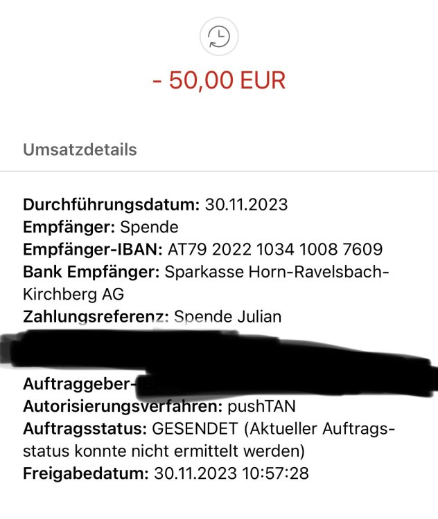 Liebe ASB Gemeinde ! Der Fanclub Alcatraz organisiert am Sonntag vor dem Heimspiel ab 14 Uhr ein Charity Punschtrinken für den kleinen Julian . Falls wer am Sonntag nicht kann , kann man auch per überweisung spenden .Jede noch so kleine oder große Spende hilft . Vielen Dank ! Empfänger: Hilfe im Eigenen Land AT79 2022 1034 1008 7609 Verwendungszweck:"Spende für Julian"14 likes -