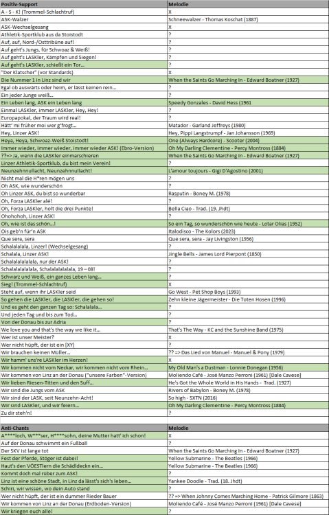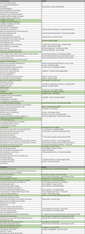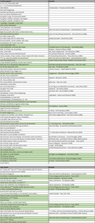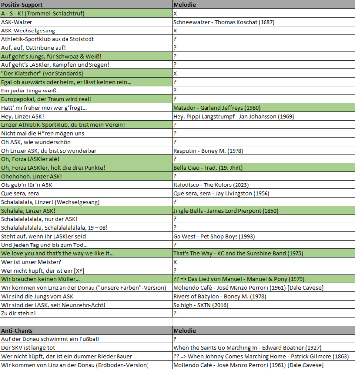 Schwarz-weiße ASB-Gemeinde! Wie vor einigen Tagen angekündigt, hat mich der Fund eines nett gestalteten Liederbuchs im LFC-Fanshop (FOTO) dazu inspiriert, mich in der ein oder anderen freien Stunde der Zusammenstellung des gesamten LASK-Liedguts zu widmen. Dazu bitte ich um eure Unterstützung - zum einen begann meine Stadionkarriere erst um das Jahr 2004, wodurch mir ältere Gassenhauer (z.B. "Dadi, Dada, da Duspara!") nicht geläufig sind. Zum anderen bin ich mir recht sicher, dass meine bisherige Erst-Zusammenstellung (siehe unten) auch in puncto aktuellerer Chants nicht vollständig ist. Was suche ich? JEGLICHE Fan-Gesänge, die ihr in der LASK-Kurve im Laufe eurer Fankarriere gehört/gesungen habt und die in der untenstehenden Auflistung noch fehlen. Gesucht werden: Titel gesamter Liedtext Original-Melodie ORIGINAL-MELODIEN. Von den 27 bisher gelisteten Chants konnte ich nur bei 11 (evtl. 12) die Originalmelodie identifizieren, die dem Fangesang zugrunde liegt. Bei manchen Chants mag es gar kein Original geben, aber wenn ihr zu einem der bereits aufgeführten Chants das Original kennt, immer her damit! Wohin mit eurem Input? Entweder hier in den Thread rein, oder... per PM an mich Was passiert damit? Aktuell ist das Ganze noch Work-in-progress. Aber im Grunde schwebt mir am Ende des Prozesses eine Umsetzung als nichtkommerzielles, hochwertiges Printprodukt vor (inkl. QR-Codes zu Audiobeispielen z.B.). Eventuell könnte man das Büchlein auch im Rahmen der sicher kommenden nächsten Charity-Aktion im Spätherbst 2024 unter die Leute bringen - aber zunächst muss mal der Content gesammelt werden Die aktuelle Liste (05.01.2024): (2x anklicken zum Vergrößern) ERGÄNZUNGEN IN GRÜN HINTERLEGT. Version 1.4 (02.01. 2023): Version 1.4 (31.12. 2023): Version 1.3 (31.12.2023): Version 1.2 (30.12.2023): Version 1.1 (30.12.2023): Version 1.0 (30.12.2023): Ich lege mein Vertrauen in die schwarz-weiße Schwarmintelligenz und bedanke mich für Eure Mithilfe! Guten Rutsch und bis demnächst im Stadion!3 likes