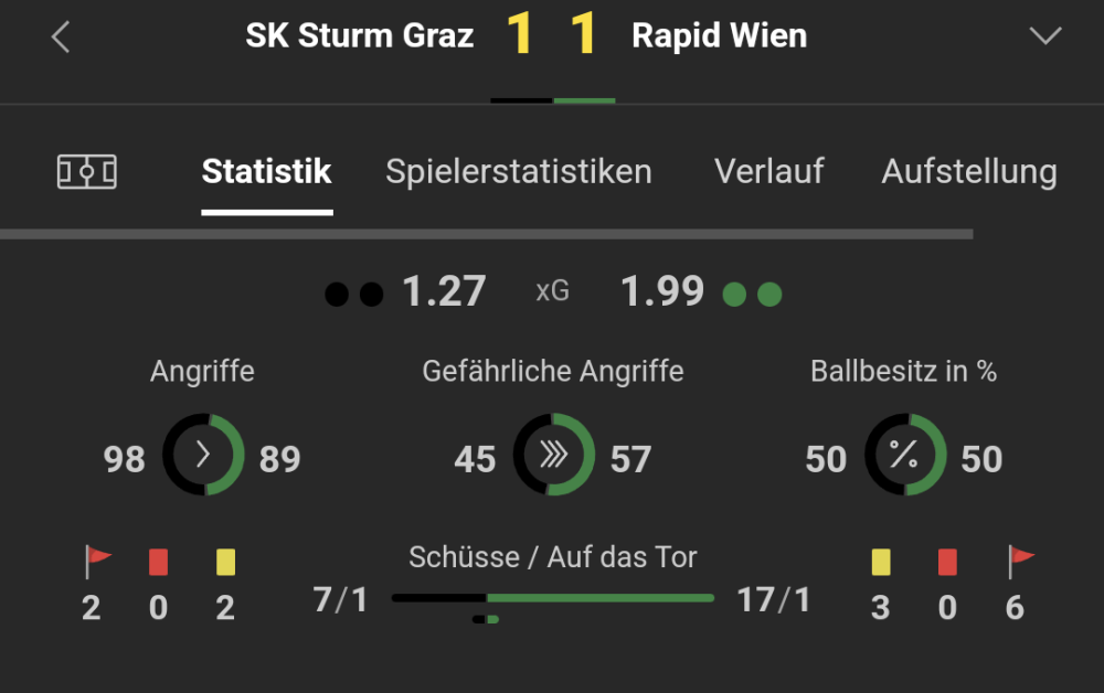 Ganz wichtiger Punkt und wieder gezeigt, dass man mit Sturm durchaus auf Augenhöhe agiert und ohne den depperten Punktverlusten im Herbst auch in der Tabelle näher dran wäre. Jetzt bitte endlich ein Derbysieg und dann gegen Lustenau und dann kann man Platz 3 ins Visier nehmen, ich trau es der Mannschaft zu. Btw. seit 3 Spielen gegen Sturm ungeschlagen Wer hat eigentlich im Februar 2014 die Vorbesprechung fürs letzte Hanappi-Derby gemacht? Bitte die Vorbesprechung aufmachen11 likes