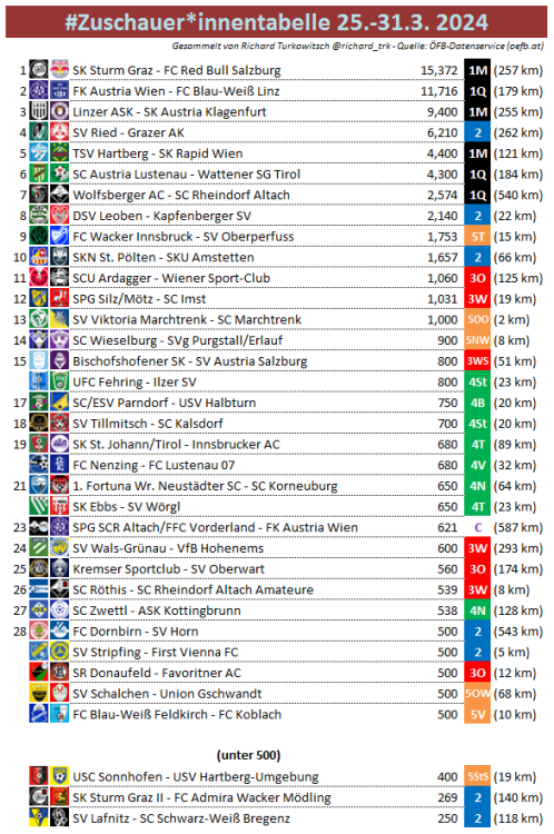 Osterwochenende mit am Haufen Unterhaus. Sturm-Dosen und Austria-wir schaffen die 10k (ich find die Austria-Zahl übrigens glaubwürdig owa y'all do y'all), LASK-Klagenfurt 9,4k. Zweitligatopspiel Ried-GAK mit 6k - bestbesuchtes Zweitligaspiel der Saison bisher. Derbies und Nachbarschaftsduelle im Bezirk Imst, in Marchtrenk, im Mostviertler Derbydreieck, in der Südoststeiermark, im Bezirk Kufstein und im Bezirk Feldkirch. https://twitter.com/richard_TRK/status/1774792430149070891 Edit: ups, Liefering-FAC vergessen. Da waren laut Datenservice 300 Leute.11 likes -