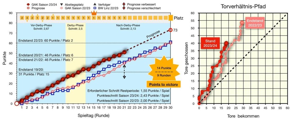 Ich habe wieder mal die Grafik aktualisiert und wir sind 14 Punkte vom Aufstieg entfernt, wofür wir 9n Runden Zeit haben. Es reicht uns bereits ein Punkteschnitt von 1,55 Punkte pro Spiel. Und mit dem erforderlichen Schnitt geht es jetzt schnell bergab: Weil der erforderliche Restpunkteschnitt berechnet sich mit der Formel r=n/m (punkte / Runden), was eine Variante der in Schule vielgeliebten Funktion f(x)=1/x ist. Und wie wir alle wissen, tut sich bei der Funktion sehr wenig bei den großen Werten von x, aber je kleiner dieses x wird (=Zahl der verbleibenden Runden) umso steiler wird die Funktion (siehe https://www.mathway.com/popular-problems/Algebra/200686). Das bedeutet, mit jeder Runde, in der wir jetzt gleich viele Punkte (oder mehr) machen als die Konkurrenz, sinkt der erforderliche Restpunkteschnitt immer schneller. Zum Beispiel: Wenn wir nächste Runde gegen den DSV gewinnen und FAC und Ried nur remisieren würden, dann genügte ab nächste Runde schon ein Schnitt von 1,0. Es geht immer schneller bergab, wegen f(x)=1/x. Falls ihr also geglaubt habt, dass man diese Funktion außerhalb der Schule niemals braucht, welch Irrtum! Sie führt sogar zur Extase des GAK-Fantums! Wer hätte das gedacht?33 likes -