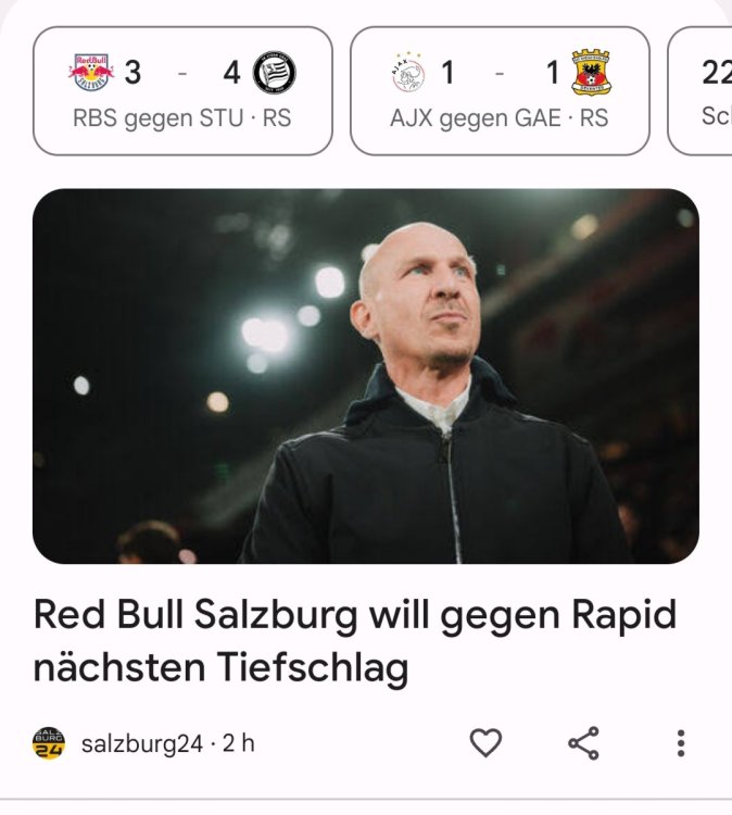 Nach gestern muss man sagen, wenn wir das am Sonntag intelligent und diszipliniert spielen, ist da mindestens ein Punkt für uns drin. Bei den Bullen sieht momentan viel nach Zufall ohne wirkliche Struktur aus. Dass sie noch immer die Individuelle Klasse haben, wissen wir eh. Genauso wie sie uns an einem guten Tag weiterhin aus dem Stadion schießen können. Diese guten Tage sind bei den Dosen aber mittlerweile recht rar geworden. Möcht sehen wie dort die Nerven flattern, wenn wir in Führung gehen.11 likes -