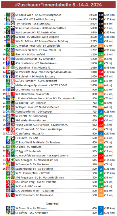ZuschauerzahlenMoatl_19 and 8 others liked ein Thema by richard trk Heavy agree bei diesem einen Satz. Jesus Christus... On topic: Zweimal 10k (beim LASK-Heimspiel hättma natürlich je nach Ansicht mehr erwarten können) ein ausverkauftes Nachbarschaftsduell mit Hartberg-Sturm und ein ausverkauftes Derby im Ländle. Wacker mal wieder über WSG, mit persönlichem Blick als Anwesender bei beiden Spielen würde ich auch sagen, das kommt so hin. Und ma kann tausendmal wissen, was a Stimmungsblock für einen Unterschied macht in echt is der Unterschied halt nochmal drastischer. Dazu noch Tonnen an Derbies und Nachbarschaftsduellen im Unterhaus: Oststeiermark (1.250!), Traunviertel (1.200!), Blaufränkischland (1.090, auch wenn das in der Vergangenheit schon höher ging), Bezirk Mattersburg, Südoststeiermark, Bezirk Feldkirchen, Südsteiermark, Osttirol (mal wieder a Ausrufezeichen, auch wenn weit entfernt von früheren Zahlen), Favoriten, südlicher Wiener Speckgürtel, Walgau, nördlicher Wiener Speckgürtel und Tennengau. Datenservice-Quellenkritik ist diese Woche definitiv auch ein bissl angebracht. Beim Wackerspiel waren zunächst 1.500 eingetragen, wurde dann aber noch auf 2.000 korrigiert. Im Stadion durchgesagt wurden 2.013 - meiner Meinung nach ist erster Unterschied schon a bissl zu viel, Zweiterer aber ganz ehrlich völlig vernachlässigbar. Aber ja, it happened. Ein anderes Fallbeispiel wäre da ein anderes Duell, bei dem in der Vergangenheit die Schwächen des Datenservices recht offenkundig waren: Viktoria gegen Wiener Sport-Club. Die Viktoria hat 272 gemeldet für dieses Spiel. Anwesende WSC'ler haben mir klar versichert, die Zahl is garantiert ein Schwachsinn. Aus eigener Besuchserfahrung bei einem früheren Duell der beiden Teams in der Oswaldgasse kann ich das bestätigen, da wurden damals 2.000 durchgesagt und eingetragen ins Datenservice wurden 500. Manchmal muss ma sich schon fragen, was das System genau bringt, wenn einzelne Vereine so offensichtlich drauf scheißen. https://twitter.com/richard_TRK/status/17798643156270000159 likes