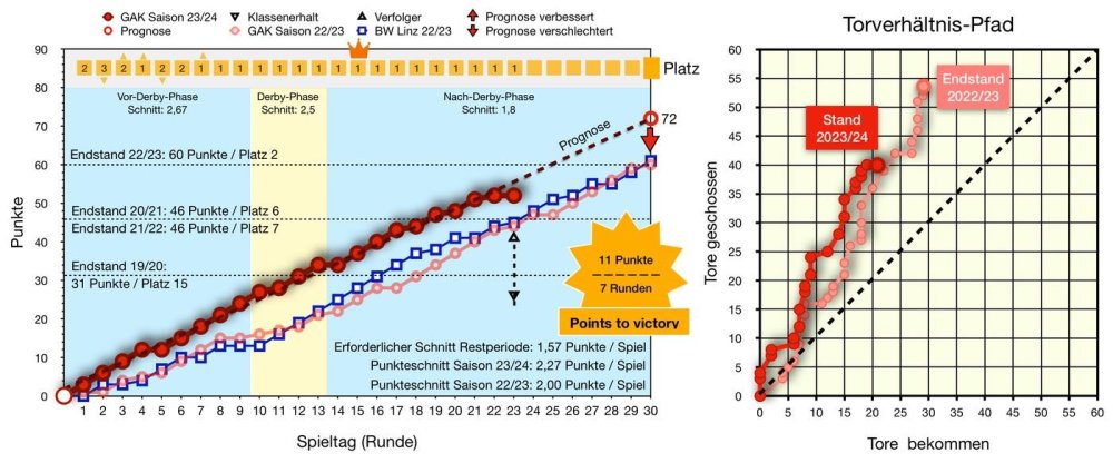 Vor dem wichtigen Wochenende noch ein rasches Update der Grafik. Wir sind auf einem guten Weg, jetzt können wir den ersten von ca. 3 noch verbleibenden Schritten in Richtung BL machen (meine private Prognose). Bei beinahe gleich vielen Toren (bekommen und gemacht) holen wir heuer deutlich mehr Punkte dabei raus. Smart, weil letztes Jahr hat nur 1 Tor gefehlt. Und die Verfolger sind heuer auch ein bisserl weniger erfolgreich als BWL letztes Jahr. Das wird sich alles gut ausgehen.14 likes -