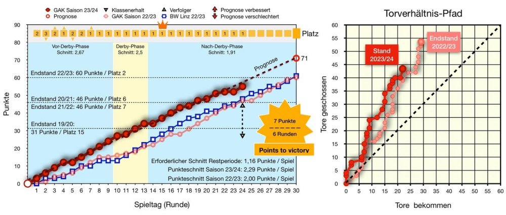 Wir sind wieder gut auf Schiene. Da man jetzt schon fast auch rechnerisch den FAC und den SKN ausschliessen kann (da müssten wir schon alles verlieren und die alles gewinnen) habe ich auf Anregung von @Casino Stadion die Formel geändert und berücksichtigt, dass wir gegen den DSV und Ried auch bei Punktegleichheit aufsteigen würden. Wir benötigen einen Rest-Schnitt von 1,16 Punkten pro Spiel, also alles unentschieden und einen Sieg. Erledigen wir dann den schnell mal den nötigen Sieg und kümmern uns dann um den Rest, würde ich vorschlagen.18 likes -