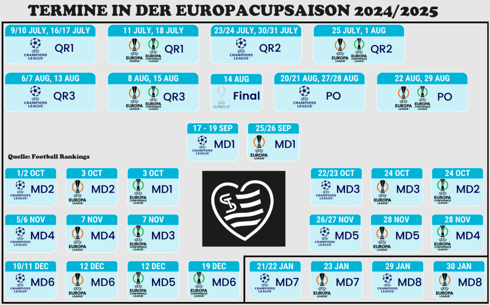 Der SK Sturm Graz in der Europacup-Saison 2024/2025! (Bild stammt vom geschätzten ASB-User @Brucki (https://brucki.blogspot.com/) Wir schreiben zwar erst den 24.04.2024 und doch hat unser SK Sturm bereits das erste große Saisonziel erreicht - nach dem 28. Spieltag der österreichischen Bundesliga steht fest, unser SK Sturm spielt auch in der Saison 2024/2025 definitiv international! Es gibt keine Konstellation mehr welche uns aus den Top 3-Rängen der Bundesliga verdrängen kann! Damit sichert sich der SK Sturm bereits zum 4x en suite eine Teilnahme am internationalen Wettbewerb! Heuer besonders interessant: Es wird die erste Saison innerhalb der UEFA-Europacup-Reform 2024/2025 sein. Was ändert sich dadurch? Die Hauptrunden der Champions League & Europa League bestehen aus einer einzigen Liga/Gruppe mit jeweils 36 Teams und 8 Spieltagen. Das gilt auch für die Conference League, allerdings gibt es dort nur 6 Spieltage. Interessante Neuerung: Es gibt in der "Ligaphase" keine Hin- und Rückspiele, sondern 8 (CL/EL) bzw. 6 (CONF) unterschiedliche Gegner in denen man die Punkte für die "Gesamttabelle" sammeln muss. Während die Top 8 direkt ins jeweilige Achtelfinale aufsteigen, spielen die Teams auf den Rängen 9 bis 24 in einer Zwischenrunde weiter. Ebenfalls eine Neuerung: Es gibt ab der "Ligaphase" keine "Abstiege/Umstiege" in andere Bewerbe mehr. Update v. 19.05.2024 - 19:09 -> DER SK STURM IST NEUER MEISTER UND SPIELT 2024/2025 CHAMPIONS LEAGUE! Diskussionen über mögliche Gegner, Auslosungen und Termine können gerne hier geführt werden! Ich werde versuchen den Startpost stets aktuell zu halten, was dann mögliche Gegner als auch Setzungen in den diversen Bewerben betrifft. Wertvolle Informationen: https://kassiesa.net/uefa/calendar2024.html (Terminplan - Europapokal 2024/2025) https://kassiesa.net/uefa/data/method5/crank2025.html (UEFA - 5-Jahreswertung) https://kassiesa.net/uefa/files/2024-27-uefa-club-competitions-scheme.png (UEFA-Qualifikationssystem zu den Wettbewerben) https://www.austriansoccerboard.at/topic/103272-der-thread-zur-uefa-klubrangliste-klub-koeffizient/#comments (ASB - Thread zum UEFA-Klubrangliste) ------------ DER EUROPACUP AUS ÖSTERREICHISCHER SICHT: Für welche(n) Bewerb(e) könnte man sich überhaupt qualifizieren: 1. Der österreichische Meister 2023/2024 hat ein Fixticket für die UEFA Champions League. 2. Der österreichische Vizemeister der Saison 2023/2024 steigt in die zweite Runde der Champions League-Qualifikation ein. Sollte man dort scheitern, geht es in der dritten Runde der Europa-League-Qualifikation weiter. Sollte man dort scheitern, geht es im Playoff der Conference League weiter. 3. Der österreichische Cupsieger (sofern er nicht Meister und auch nicht Vizemeister wird) steigt im Playoff der Europa League ein und hat damit im worst case die Conference League-Ligaphase sicher. 4. Der Drittplatzierte der Saison 2023/2024 steigt im Playoff der Europa League ein, es sei denn der österreichische Cupsieger ist schlechter in der Endtabelle platziert. Dann steigt man bereits in der zweiten Runde der Europa League-Qualifikation ein. Scheitert man dort, geht es in der dritten Qualifikationsrunde der Conference League weiter. 5. Der Viertplatzierte/Fünftplatzierte bzw. Playoffsieger des (OPO vs. UPO) (abhängig vom Cupsieger und dessen Platzierung) steigt in der zweiten Qualifikationsrunde der Conference League ein. Bei einer Niederlage (gilt auch für die dritte Runde sowie im Playoff) gibt es kein Auffangnetz und das europäische Abenteuer ist auch schon wieder beendet. ------------16 likes