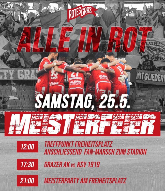 Die Fans & Kurve des GAKBiancaRossa and 30 others liked ein Thema by Sub7ero 17 Jahre Warten hat ein Ende! Mit unbeugsamen Willen & Leidenschaft im Herzen haben wir diesen Verein wieder dorthin gebracht, wo er hingehört. Treffpunkt für alle Roten am 25.05 ist 12:00 Uhr am Freiheitsplatz. Gemeinsam werden wir uns per Fußmarsch zum Stadion Liebenau aufmachen und ganz Graz zeigen, dass der GAK wieder da ist! Nach dem Spiel steigt ab 21:00 Uhr die Meisterparty am Freiheitsplatz. Dresscode für den gesamten Tag: ALLE IN ROT! Bevor es soweit ist, empfangen wir die Mannschaft am Samstag gegen Horn noch mit einem meisterlichen Auftritt auf den Rängen und genießen gemeinsam die letzten zwei Auswärtsspiele in dieser Liga! WE ARE GAK! UNITED WE STAND! Natürlich wird die Kurve auch bei der offiziellen (Vereins)Meisterfeier am 29.05. lautstark vertreten sein.31 likes