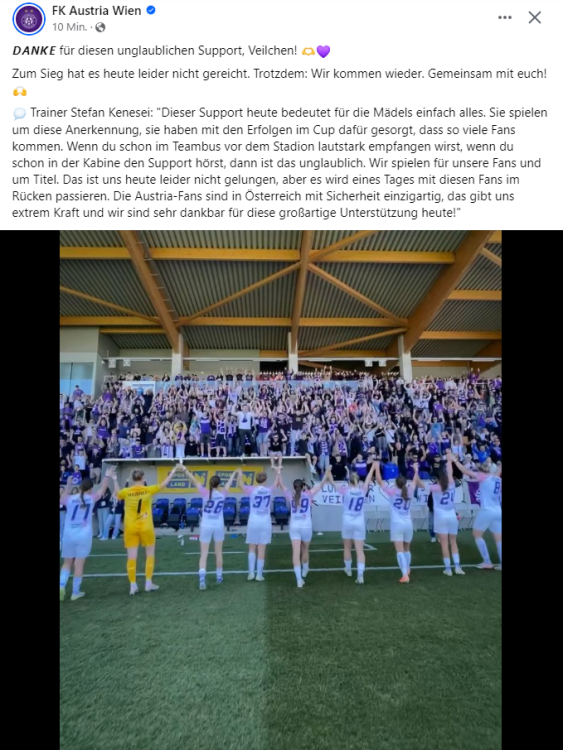 Fanszene Austria WienCeBee and 7 others liked ein Thema by grasshopper Richtig leiwander support heute beim Frauen Cup-Finale. Ultras, Normalos, Oldschool, Newschool, Oma, Opa und die Kids, mit Megaphon, ohne, deutsch, englisch, italienisch......alle(s) dabei gewesen und 90 min supported. Forza Viola!8 likes