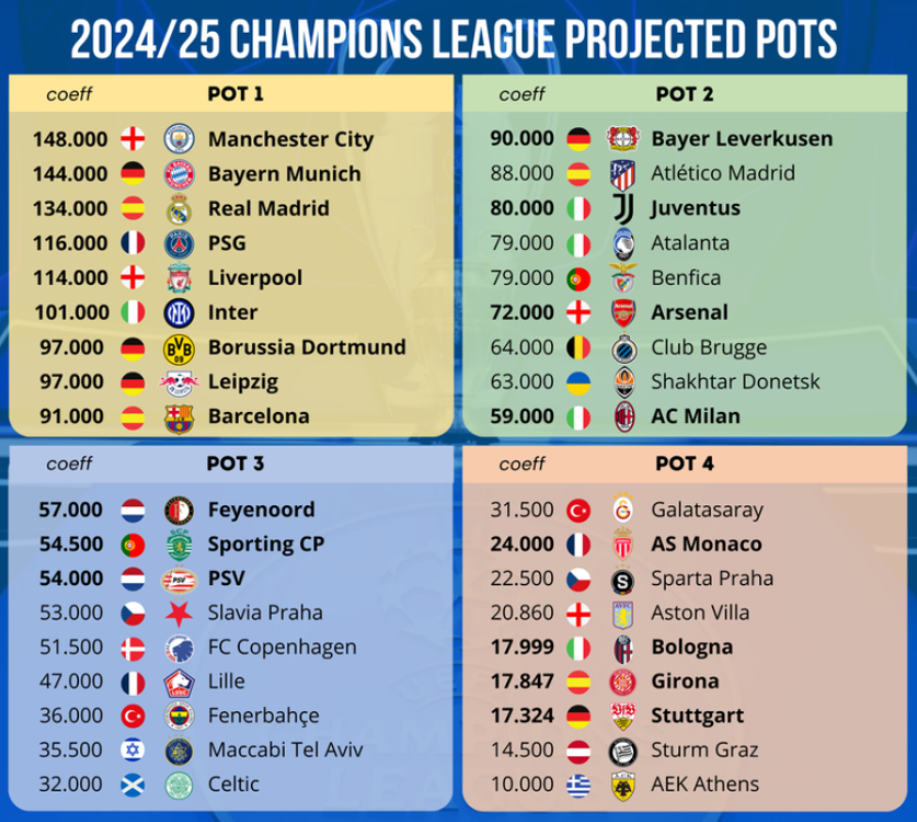 Sobald alle nüchtern sind, hier die aktuell "prophezeiten" Topfeinteilungen für die UEFA Champions League 2024/2025! (Stand datiert vom 14.05.2024 - deswegen sind wir hier noch nicht fett (= fix qualifiziert), also jetzt grafisch bezogen - einfach dazu denken) Die Regeln sind einfach: Ihr dürft euch aus allen Töpfen (auch Topf 4) jeweils 2 Teams wünschen. Ergibt somit 8 Gegner, von denen wir 4 in Klagenfurt begegnen und 4 auswärts. (Pro Topf eine Begegnung zu Hause und auswärts) Maximal kann man in dieser Ligaphase nur 2 Vereine eines selben Verbands begegnen (sprich: es wären z.B. 2 Deutsche/ möglich aber nicht 3 oder 4). Theoretisch könnte der Spielplan dann so aussehen: SK Sturm vs. Real Madrid Aston Villa vs. SK Sturm SK Sturm vs. Kopenhagen AC Milan vs. SK Sturm SK Sturm vs. Stuttgart Liverpool FC vs. SK Sturm SK Sturm vs. Juventus Celtic vs. SK Sturm ----- Ich sags gerne nochmals... zwickts euch ruhig! Und macht euch für eine internationale Wetzung der Sonderklasse bereit!20 likes