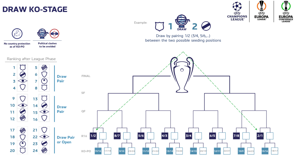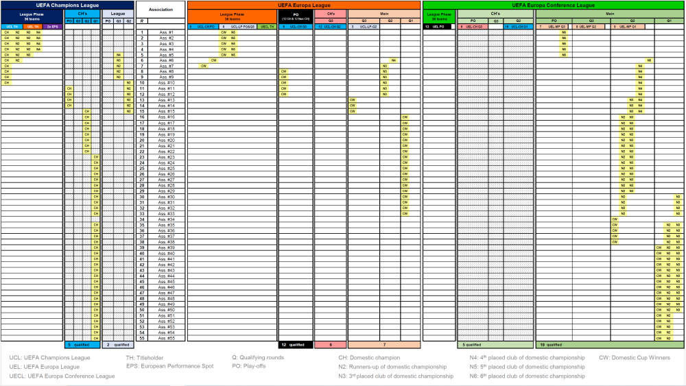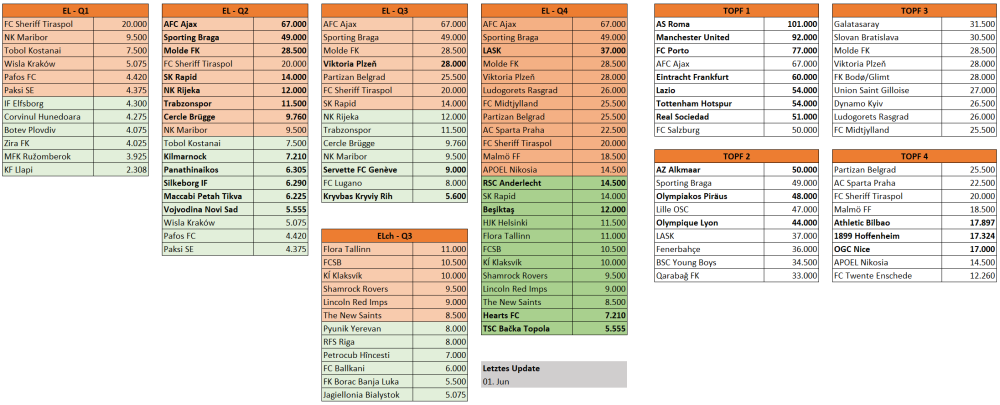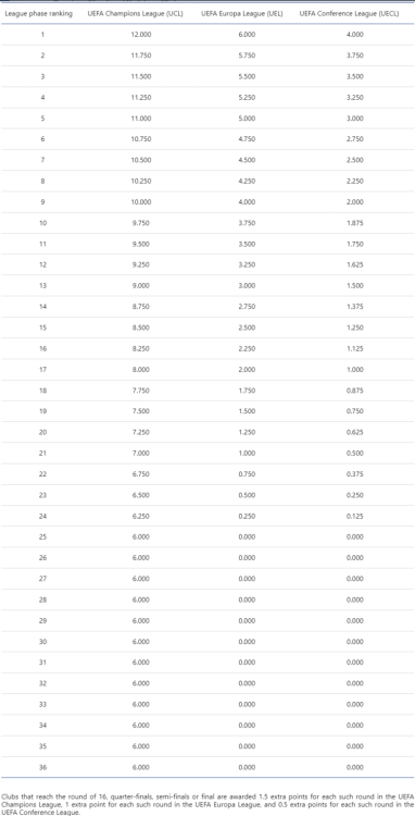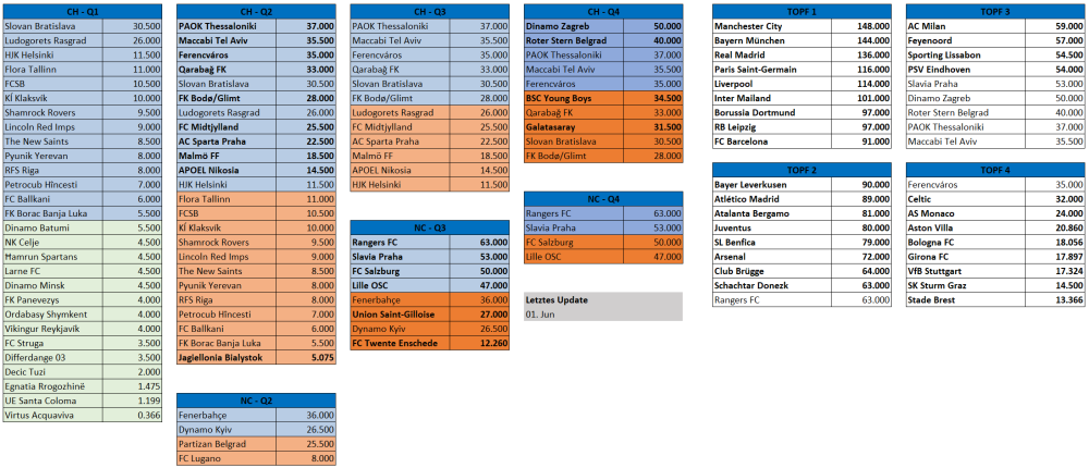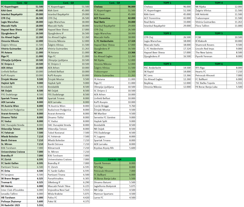 Das abschließende Ranking der Saison 2024/25 ist relevant für die Europacup Saison 2026/27. Die international teilnehmenden Klubs 2026/27 werden in den Meisterschaften und Cup-Bewerben 2025/26 ermittelt. Ausgangslage 2024/25 09. (5) 3.100 - 6.700 - 11.80 - 12.00 - 0.000 - 33.600 +5.600 10. (5) 6.600 - 6.700 - 6.750 - 13.50 - 0.000 - 33.550 +5.550 11. (4) 7.000 - 6.750 - 6.250 - 8.750 - 0.000 - 28.750 +0.750 12. (5) 6.700 - 10.40 - 4.900 - 4.800 - 1.200 - 28.000 13. (4) 6.500 - 7.625 - 5.750 - 8.000 - 0.000 - 27.875 -0.125 14. (5) 8.500 - 7.900 - 3.500 - 6.400 - 1.200 - 27.500 -0.500 15. (4) 5.100 - 8.000 - 2.125 - 11.40 - 0.000 - 26.625 -1.375 16. (5) 5.125 - 7.750 - 8.500 - 5.200 - 0.000 - 26.575 -1.425 17. (4) 4.125 - 7.800 - 5.900 - 8.500 - 0.000 - 26.325 -1.675 18. (4) 4.000 - 4.625 - 7.750 - 6.875 - 0.000 - 23.250 -4.750 19. (5) 6.800 - 4.200 - 5.700 - 4.100 - 1.200 - 22.000 -6.000 20. (5) 5.500 - 9.500 - 5.375 - 1.400 - 0.000 - 21.775 -6.225 21. (4) 5.900 - 6.000 - 3.375 - 5.875 - 0.000 - 21.150 -6.850 In Klammer die Anzahl der im Europacup 2024/25 vertretenen Klubs pro Land Bei Österreich, Schottland und Ukraine sind bereits die 6 Bonuspunkte für ihre fixen CL-Teilnehmer eingetragen. Teilnehmende Klubs 2024/25 09. CLPO: Galatasaray (31,5); CLN2: Fenerbahçe (36); ELPO: Beşiktaş (12); ELQ2: Trabzonspor (11,5); ConQ2: İstanbul Başakşehir (29) 10. CLQ2: AC Sparta Praha (22,5); CLN3: SK Slavia Praha (53); ELQ3: Viktoria Plzeň (28); ConQ2: Baník Ostrava (7,21); Mladá Boleslav (7,21) 11. CLQ2: Maccabi Tel Aviv (35,5); ELQ2: Maccabi Petah Tikva (6,225); ConQ2: Maccabi Haifa (18); Hapoel Beer Sheva (17) 12. CL: SK Sturm Graz (14,5); CLN3: FC Salzburg (50); ELPO: LASK (37); ELQ2: SK Rapid (14); ConQ2: FK Austria Wien (8) 13. CLQ2: FK Bodø/Glimt (28); ELQ2: Molde FK (28,5); ConQ2: SK Brann Bergen (6,325); Tromsø IL (6,325) 14. CL: Celtic FC (32); CLN3: Rangers FC (63); ELPO: Hearts FC (7,21); ELQ2: Kilmarnock FC (7,21); ConQ2: St. Mirren FC (7,21) 15. CLQ2: PAOK Thessaloniki (37); EL: Olympiakos Piräus (48); ELQ2: Panathinaikos (6,305); ConQ2: AEK Athen (10) 16. CLPO: BSC Young Boys (34,5); CLN2: FC Lugano (8); ELQ3: Servette FC (9); ConQ2: FC Zürich (6,595); FC Sankt Gallen (6,595) 17. CLQ2: FC Midtjylland (25,5); ELQ2: Silkeborg IF (6,29); ConQ2: Brøndby IF (7); FC Kopenhagen (51,5) 18. CLQ2: Jagiellonia Białystok (5,075); ELQ1: Wisla Krakau (5,075); ConQ2: Śląsk Wrocław (5,075); Legia Warschau (18) 19. CL: Schachtar Donezk (63); CLN2: Dynamo Kyiv (26,5); ELQ3: Kryvbas Kryviy Rih (5,6); ConQ2: SC Dnipro-1 (10,5); Polissa Zhytomyr (5,6) 20. CLPO: FK Roter Stern Belgrad (40); CLN2: Partizan Belgrad (25,5); ELPO: TSC Bačka Topola (5,555); ELQ2: Vojvodina Novi Sad (5,555); ConQ2: FK Radnički 1923 (5,555) 21. CLPO: Dinamo Zagreb (50); ELQ2: NK Rijeka (12); ConQ2: Hajduk Split (9); NK Osijek (8,5) CL ... Champions League Gruppenphase CLPO ... Champions League Play-off im Meisterweg CLQ2 ... Champions League Qualifikationsrunde 2 im Meisterweg etc. CLN2 ... Champions League Qualifikationsrunde 2 im "Ligaweg" etc. EL ... Europa League Gruppenphase ELPO ... Europa League Play-off ELQ1 ... Europa League Qualifikationsrunde 3 etc. ConQ2 ... Conference League Qualifikationsrunde 2 etc. In Klammer der jeweilige Klubkoeffizient Setzungen Champions League Europa League Conference League oder im online-Excel-link 2 Fixteilnehmer in Ligaphase Galatasaray (31,5) ist im Champions League Playoff höchstwahrscheinlich ungesetzt. Fenerbahçe (36) ist in CL-N2 gesetzt und trifft dort auf Partizan Belgrad oder FC Lugano. Danach ungesetzt. Beşiktaş (12) hat Chancen auf eine Setzung im Europa League Playoff. Trabzonspor (11,5) ist in EL-Q2 gesetzt, danach ungesetzt. İstanbul Başakşehir (29) steigt in ConL-Q2 ein und ist jede Runde gesetzt. 1 Fixteilnehmer Sparta Prag (22,5) ist in CL-Q2 gesetzt, in CL-Q3 ungesetzt. Im EL-PO wieder gesetzt. Slavia Prag (53) ist in CL-N3 und im CL-PO gesetzt. Viktoria Pilsen (28) ist in EL-Q3 und im Playoff gesetzt. Baník Ostrava (7,21) ist in ConL-Q2 gesetzt, danach ungesetzt. Mladá Boleslav (7,21) ist in ConL-Q2 gesetzt, danach ungesetzt. Maccabi Tel Aviv (35,5) steigt in CL-Q2 ein und ist jede Runde gesetzt. Petah Tikva (6,225) ist in EL-Q2 und ConL-Q3 ungesetzt. Maccabi Haifa (18) steigt in ConL-Q2 ein und ist jede Runde gesetzt. Beer Sheva (17) steigt in ConL-Q2 ein und ist jede Runde gesetzt. 3 Fixteilnehmer Sturm (14,5) steht in der Champions League. Salzburg (50) ist in CL-N3 gesetzt und trifft dort auf Union Saint-Gilloise, FC Twente, den Sieger aus Dynamo Kyiv gegen Partizan/Lugano oder Fenerbahçe gegen Lugano/Partizan. Im CL-PO ungesetzt. LASK (37) ist im Europa League Playoff gesetzt. Rapid (14) ist in EL-Q2 und Q3 gesetzt. Im Playoff voraussichtlich ungesetzt. Austria (8) ist in ConL-Q2 gesetzt, in Q3 voraussichtlich ungesetzt, aber mit Chancen auf Setzung. Bodø/Glimt (28) ist in CL-Q2 und bei CL-Sieger Real in CL-Q3 gesetzt, im Playoff ungesetzt. Molde (28,5) steigt in EL-Q2 ein und ist jede Runde gesetzt. Brann Bergen (6,325) ist in ConL-Q2 ungesetzt. Tromsø (6,325) ist in ConL-Q2 ungesetzt. 3 Fixteilnehmer Celtic (32) steht in der Champions League. Rangers (63) sind in CL-N3 und im Playoff gesetzt. Hearts (7,21) ist im EL-Playoff ungesetzt. Kilmarnock (7,21) ist in EL-Q2 und ConL-Q3 ungesetzt. St. Mirren (7,21) ist in ConL-Q2 gesetzt, danach ungesetzt. 1 Fixteilnehmer PAOK (37) steigt in CL-Q2 ein und ist jede Runde gesetzt. Olympiakos (48) spielt in der Europa League. Panathinaikos (6,305) ist in EL-Q2 und ConL-Q3 ungesetzt. AEK (10) ist in ConL-Q2 und Q3 gesetzt, im Playoff ungesetzt. 1 Fixteilnehmer YB (34,5) ist im Champions League Playoff möglicherweise ungesetzt. Lugano (8) ist in CL-N2 ungesetzt und trifft dort auf Fenerbahçe oder Dynamo Kyiv. In EL-Q3 und ConL-Playoff ebenfalls ungesetzt. Servette (9) ist in EL-Q3 und ConL-Playoff ungesetzt. Zürich (6,595) ist in ConL-Q2 gesetzt, in ConL-Q3 ungesetzt. Sankt Gallen (6,595) i