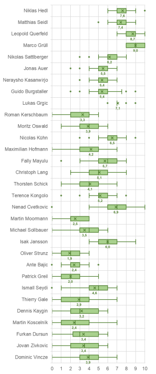hiermit präsentiere ich euch die ergebnisse zur sk rapid-notenkonferenz der saison 2023/24. 59 user haben bis zu 31 spieler dieser spielzeit auf einer skala von 0 bis 10 bewertet (0 war die schlechteste und 10 die beste note). 16 spieler haben von allen usern eine bewertung erhalten, ganze 40 user haben zu jedem spieler eine note abgegeben. in der tabelle sind die ränge anhand der mittelwerte, die mittelwerte und die anzahl der bewertungen gelistet, sortiert nach den rängen. dazu die leistungsdaten der vergangenen saison aus dem eingangspost. wenig überraschend ist marco grüll mit einer note von 9,0 zum besten spieler gewählt worden. knapp dahinter steht querfeld mit 8,7, mit etwas abstand folgen hedl mit 7,6, seidl (7,4) und grgic (7,1). unter 7 folgen cvetkovic mit vergleichsweise wenigen spielminuten und kühn und sattlberger. die top 10 sind mit jansson und mayulu dann komplett, wobei wir schon bei noten unter 6,0 sind. auer, kasanwirjo und burgstaller sind was noten (5,4-5,5) und spielminuten (2089-2765) betreffen eng beisammen. hinter kongolo (5,2) und lang (5,1) folgt seydi mit nur 192 spielminuten auf rang 16. deutlich mehr minuten hatten hofmann, schick und oswald auf den plätzen 17-19 - letzterer ist ex aequo mit vincze bei einer note von 3,9 nach kaum mehr spielminuten (54) als bewertungen (42). auf den weiteren rängen sind sollbauer und jungprofis wie dursun und zivkovic zu finden. kerschbaum sticht mit 1843 minuten auf rang 24 deutlich heraus, hinter ihm folgen nur noch dreistellige spielminuten. diese "abschlussgruppe" mit noten von 1,9-3,2 besteht neben für die kampfmannschaft kaum relevanten spielern (kaygin, moormann) aus langzeitverletzten (gale, strunz) und abgegebenen spielern (bajic, koscelnik, greil). Spieler ASB-Bewertungen Leistungen Rang Mittelwert Noten Minuten Spiele Tore Vorlagen Marco Grüll 1 9,0 59 3100 39 21 12 Leopold Querfeld 2 8,7 59 3390 38 3 1 Niklas Hedl 3 7,6 59 3810 42 0 0 Matthias Seidl 4 7,4 59 3495 42 10 7 Lukas Grgic 5 7,1 59 1878 26 2 2 Nenad Cvetkovic 6 6,9 57 738 10 0 0 Nicolas Kühn 7 6,5 59 1600 22 3 7 Nikolas Sattlberger 8 6,2 59 3063 38 0 1 Isak Jansson 9 6,0 58 591 12 1 1 Fally Mayulu 10 5,7 59 1475 35 11 3 Jonas Auer 11 5,5 59 2765 34 1 2 Neraysho Kasanwirjo 12 5,4 59 2234 28 0 1 Guido Burgstaller 12 5,4 59 2089 27 9 6 Terence Kongolo 14 5,2 59 953 15 0 1 Christoph Lang 15 5,1 59 1133 16 3 2 Ismaïl Seydi 16 4,6 49 192 6 0 0 Maximilian Hofmann 17 4,2 59 1513 23 0 1 Thorsten Schick 18 4,1 56 1095 21 0 6 Moritz Oswald 19 3,9 59 1822 34 0 4 Dominic Vincze 19 3,9 42 54 2 0 0 Michael Sollbauer 21 3,5 58 643 10 0 0 Furkan Dursun 22 3,4 44 92 6 0 0 Jovan Zivkovic 22 3,4 42 73 9 0 0 Roman Kerschbaum 24 3,3 59 1843 36 2 2 Dennis Kaygin 25 3,2 46 149 5 0 0 Thierry Gale 26 2,9 47 188 7 1 1 Martin Moormann 27 2,5 57 721 15 1 2 Ante Bajic 28 2,4 49 339 12 2 2 Martin Koscelník 28 2,4 44 140 3 0 0 Patrick Greil 30 2,0 50 255 10 0 0 Oliver Strunz 31 1,9 50 369 17 2 0 unten ist die grafische aufbereitung in form von box-plots dargestellt. die boxen bilden die häufigsten 50% der noten, weiters ist jeweils der mittelwert (x, beschriftet) angegeben. dargestellt sind dann noch der median, min.- bzw. max.-werte und ausreißer (über das 1,5-fache der boxhöhe von der box entfernt). die spieler sind im gegensatz zu der tabelle in der grafik nach den spielminuten sortiert (fallend von oben nach unten). hier erkennt man auch wieder deutlich, dass es nach den top 4 der spielminuten einen abfall gibt. spieler von sattlberger bis grgic zeigen noch mittelmäßige bewertungen bei vielen spielminuten (1900~3100). dahinter stechen der abgegebene kühn positiv und kerschbaum und oswald etwas negativ heraus. gerne mehr gesehen anstatt unter 1000 spielminuten hätte man wohl bei kongolo und vor allem cvetkovic und jansson. ab strunz (mit der schlechtesten aller noten) folgen die spieler mit jeweils einigen "0er-bewertungen", positiv hervorheben könnte man hier aber noch seydi. da die grafik auf 750 pixel höhe reduziert wird, hier der link zum öffnen. jetzt folgt noch die auswertung zur veränderung der noten im vergleich zum vorjahr (saison 2022/23). hier konnten von 16 spielern nur fünf eine verbesserung in dieser saison zeigen - allen voran der "aufsteiger des jahres" sattlberger mit +3,5. der spieler des jahres grüll folgt auf rang zwei, da er vergangenes jahr "nur" 6,8 bekam. querfeld, hofmann und kühn sind die weiteren spieler mit einer verbesserung. strunz war vergangenes jahr in dieser wertung auf rang 1, musste aber wieder 3,4 punkte abgeben. den noch größeren "absturz" hat burgi hingelegt, der sieger der notenkonferenz des vorjahres (9,6!) ist nur noch bei 5,4 bzw. auf rang 12. Spieler Rang Mittelwert Nikolas Sattlberger 1 +3,5 (6,2) Marco Grüll 2 +2,2 (9,0) Leopold Querfeld 3 +1,6 (8,7) Maximilian Hofmann 4 +1,5 (4,2) Nicolas Kühn 5 +0,8 (6,5) Roman Kerschbaum 6 -0,1 (3,3) Michael Sollbauer 7 -0,5 (3,5) Jonas Auer 8 -0,6 (5,5) Ante Bajic 9 -0,8 (2,4) Niklas Hedl 10 -0,9 (7,6) Moritz Oswald 11 -1,1 (3,9) Martin Moormann 12 -1,4 (2,5) Patrick Greil 13 -1,8 (2,0) Thorsten Schick 14 -1,9 (4,1) Oliver Strunz 15 -3,4 (1,9) Guido Burgstaller 16 -4,2 (5,4) zum abschluss nochmals danke an alle die abgestimmt und diese daten ermöglicht haben. und herzlichen glückwunsch an grüll, den spieler der saison 2023/24!10 likes