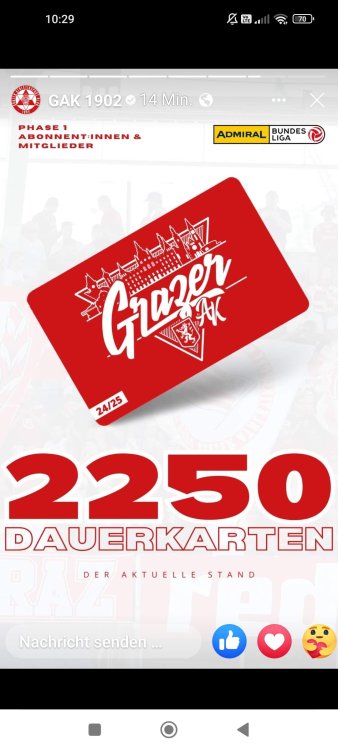 Ich bleib dabei, wir werden auch Spiele vor 4.000 Zusehern haben, es wird im Laufe der Saison auch Spiele geben, wo es Saukalt ist und wo es um so gut wie nix geht. Wir haben jetzt 2 Frühjahre hinter uns in denen wir sehr viele super wichtige Spiele hatten, eben solche wo viele Erfolgsfans auch kommen. Ich kenn nicht mehr viele Rote die bei den letzten Spielen nicht ins Stadion gegangen sind, und welche Meinen die kommen nur in der Bundesliga, nein die waren alle schon dabei in der Schlussphase. Gegen Rapid, Austria,Lask kommen dann 500-1000 Auswärtsfans dazu. Ich wär mit einem Schnitt zwischen 6.500 und 7.000 schon sehr zufrieden, den dann sind wir weiter gewachsen.15 likes