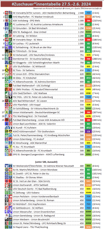 ZuschauerzahlenHiasl99 and 8 others liked ein Thema by richard trk So. Nachdem letzte Woche ein Siebtligaspiel das bestbesuchteste Spiel der Woche war, hab ich mir amal die Hackn angetan und wirklich alle Ligen durchgeklickt. It sucked ass and shit, I'm not doing that again. Aber ja, im Meisterschaftsfinish mit jeder Menge Titelentscheidungen, Abstiegskämpfen und einigen Derbies macht die Beschränkung auf die obersten 5 Ligen wenig Sinn. Alle Derbies aufzählen derblas I jetzt ah ned, muss ich gestehen. Hier wäre auf jeden Fall die volle Liste https://twitter.com/richard_TRK/status/1800202869137920391 (verlinkt die normale Form mit obersten 5. Ligen) (Die Durchschnitte kommen nächste Woche, wenn wirklich die allerletzten Spiele gespielt wurden) Rgh, natürlich musste irgendwas falsch sein, die Liste ist selbstverständlich vom 3.-9.6.9 likes