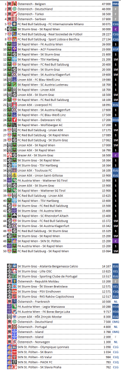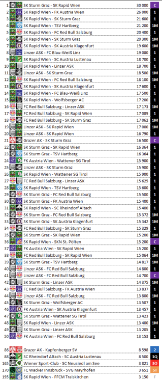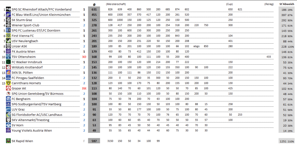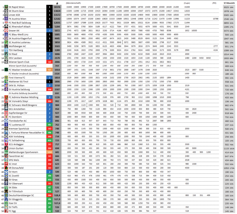 So, hier wäre der Saisonrückblick. Pardon, mich haben einzelne Teile davon afoch straight up ned zaht nachzuschauen Zunächst mal die 50 bestbesuchtesten Spiele der Saison im österreichischen Ligabetrieb und zum Vergleich die 50 bestbesuchten Spiele auf österreichischem Boden. Bei Ersterem zum Vergleich in der Gesamtliste das bestbesuchte Zweitligaspiel, das bestbesuchte Spiel in am Stadion <10.000 (ich wollt afoch a Vorarlbergderby drin haben, ich sag's wie's is), das bestbesuchte Regionalligaspiel, das bestbesuchte Spiel in den Landesverbänden und das bestbesuchte Frauenspiel. Bei Zweiterem hab ich alle Europacup- und Nationalteamspiele reingenommen, weil nachschauen musste ich sie ja so und so. Und die Endtabelle der Durchschnitte folgt auf dem Fuße. Die Top 50 müssten stimmen, auch wenn ich ned alle Vereine angschaut hab. Bei den Frauen stimmen die Top 15 auf alle Fälle, im Unterhaus war nix sonst regelmäßig über 100. Zuschauer*innenzahlen bei Testspielen find ich persönlich ned super aussagekräftig, aber sie zu verschweigen käme mir auch deppert vor, deswegen sind die Rapidfrauen auch dabei - halt quasi außer Konkurrenz. Die "volle" Tabelle (bei den Männern die obersten 3 Ligen, alle ÖFB-Cup Teilnehmer und sonst noch ein paar von mir ausgewählte Vereine) gäbe es hier: https://docs.google.com/spreadsheets/d/1dnzJx5R8mOQDAjERPVabZ4a4ox3tGaYXqrH0_TJydeI/edit?gid=73170107#gid=73170107 Und des Alles auf meinem Twitter auch noch amal: https://twitter.com/richard_TRK/status/1811053580406694328 Und als ASB-Bonus hier nochmal ein billigst zsammgschustertes Excel-Diagramm mit den Top30 der Schnitte.9 likes -