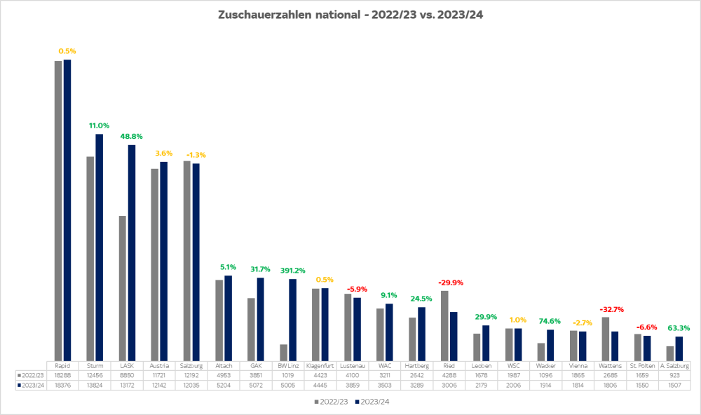 Top 5 sind zuschauertechnisch jetzt schon auf einem wirklich soliden Niveau, Altach, BWL & GAK dahinter eigentlich ein richtig guter Mittelbau (Klagenfurt rein von den Zahlen her auch, aber in der großen Schüssel halt nicht optimal) - WAC, Hartberg & vor allem Wattens natürlich weiterhin ein kompletter Krampf. Hab mir nochmal die Daten vom @richard trk aus dem Vorjahr und von heuer geschnappt und verglichen. Top-Entwicklung logischerweise 2x in Linz durch Aufstieg & Umzug, 2x in Graz durch die sportlichen Erfolge, sowie in Leoben, Hartberg, Innsbruck & im violetten Salzburg. Richtig schlecht eigentlich nur in Ried (Abstieg) & Wattens, wo es heuer noch amal deutlich trostloser war als im Vorjahr.9 likes -
