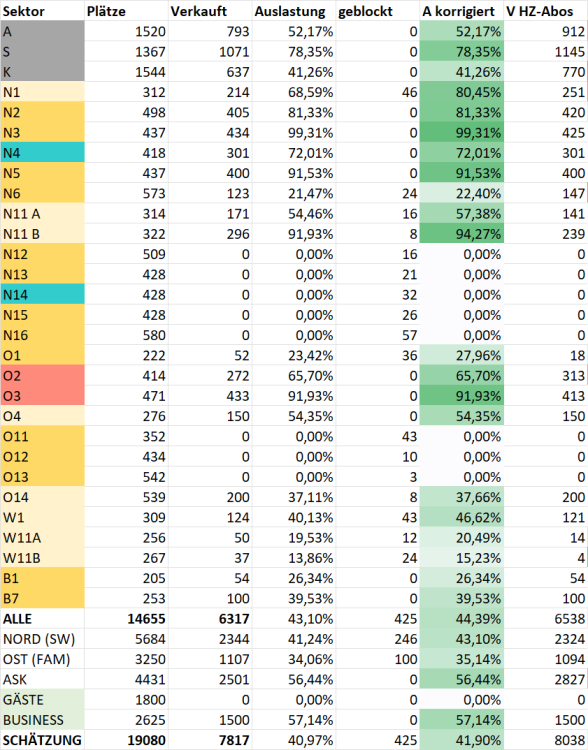 Dauerkarten-Update: Auf die einzelnen Kategorien umgelegt zeigen sich folgende Änderungen im Vergleich zum heurigen Frühjahr: Im Stehplatzbereich konnte das Minus im Vergleich zum Verkaufsstart mehr als halbiert werden, noch stehen wir hier aber bei knapp 300 Abos weniger. Man muss aber auch beachten, dass in diesem Bereich mindestens 100 Frühjahresabos verkauft worden sein dürften, also das Minus im Vergleich zur letzten Herbstsaison kleiner ist. Im Sitzplatzbereich sind wir hingegen schon mit knapp 70 Abos im Plus, was auf die deutlichen Zuwächse in der Kategorie "Sitzplatz Kurve" zurückzuführen ist. Die Daten basieren auf Winkelmessungen und Platzzählungen.18 likes
