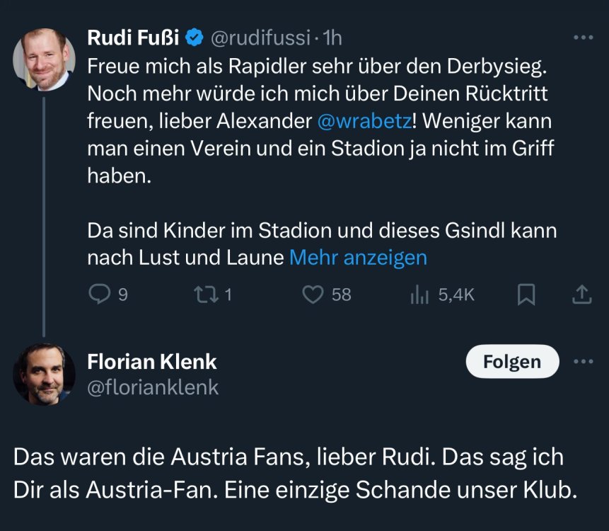 Im Übrigen bin ich für heute der Meinung, dass die Schuldfrage deutlich abgestuft ist: 1. Austria Fans 2. Die Exekutive 3. Die Rapidfans Für die letztliche Eskalation spielt das aber keine Rolle, daran waren Austria- und Rapidfans gleich beteiligt.22 likes