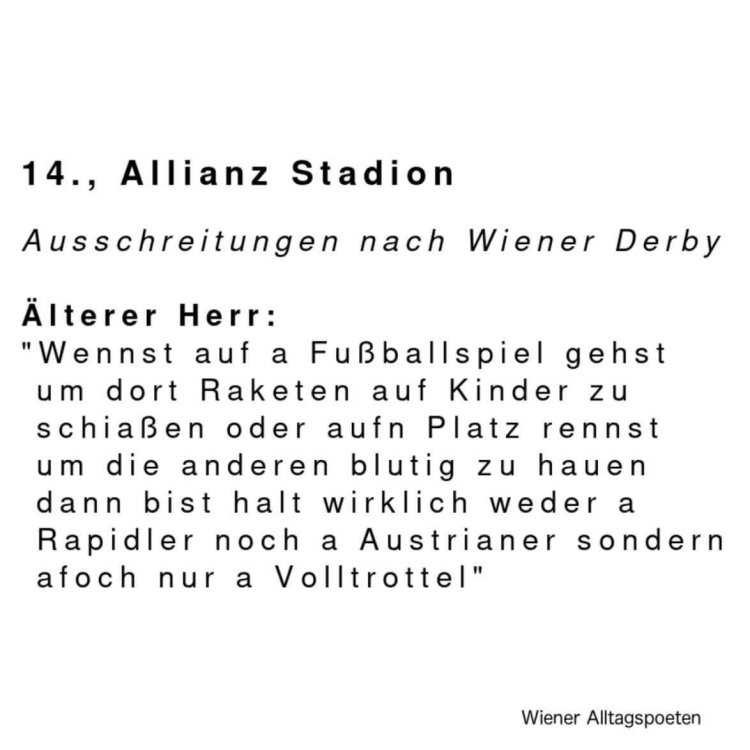 Fanszene HütteldorfKambiz and 23 others liked ein Thema by little beckham This. Mir geht das ganze Gerede von wegen Ehre und Territorium derart auf den Sack, ich kann nicht genug kotzen. Das ist Steinzeitdenke und hat mit Fußball nichts zu tun. Wenn man unbedingt möchte, dann sucht euch irgendwo eine Wiese, teilt sie in zwei Hälften und nennt sie von mir aus „Ultra-Hälfte“ und „Fanatics-Hälfte“ und dann spielt Stellungskrieg und hauts euch die Schädeln ein. Mir wurscht, aber missbraucht nicht den leiwandsten Klub der Welt für so eine kriminelle Scheiße.24 likes