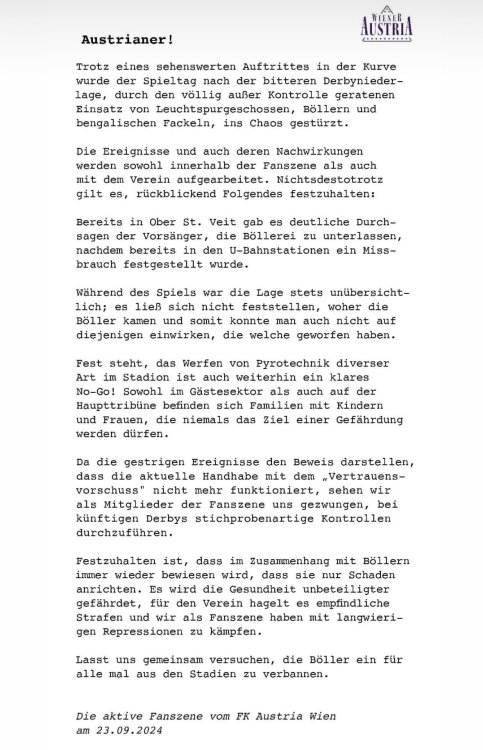 Fanszene Austria Wienfirewhoman and 37 others liked ein Thema by Lokus2 Es sind weder die Bundesliga, noch die Wiener Linien, noch die Ordner, noch die Polizei oder sonst wer schuld an dieser Situation. Schuld sind einzig und alleine - und jetzt verzeiht mir diesen Ausdruck - dermaßen hirnbefreite Personen auf beiden Seiten, dass es schlimmer nicht geht. Alles andere ist eine Ausrede, um nur ja keine Verantwortung für das eigene Handeln suchen zu müssen. Und genau darum geht es - Verantwortung für das eigene Tun zu übernehmen, mit allen Konsequenzen, die dazugehören. Und weil`s grad so schön dazu passt: Mir hat gerade ein Verein abgesagt, der mit einem Bus voller Kids gegen WSG Tirol am 26.10. gekommen wäre - Stichwort "violettes Niederösterreich". Die Eltern wollen nicht, dass die Kids zu uns kommen wegen den Ereignissen von gestern. Und ja - ich kann`s sogar verstehen. Danke, ihr Sautrotteln von Böllerwerfern, Raketenzünder und Schläger - schleicht`s euch bitte als "Fans" der Austria, das seid ihr sowieso nicht!38 likes