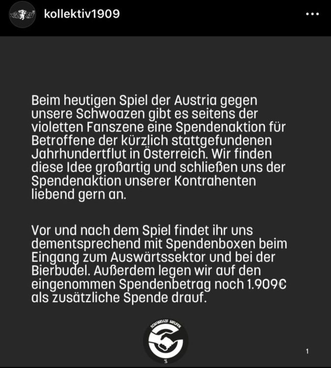beim heutigen spiel hat die austria eine spendenaktion für die flutopfer. da das natürlich eine großartige sache ist, beteiligen wir uns auch im auswärtssektor an der spendenaktion und es wird dort vor und nach dem spiel spendenboxen geben. außerdem geben wir auf die spendeneinnahmen noch 1.909€ zusätzlich dazu! gespendet wird alles an Österreich Hilft Österreich. weitere infos: https://www.schwoazehelfen.at/hilfe-fuer-die-betroffenen-der-flutkatastrophe/16 likes