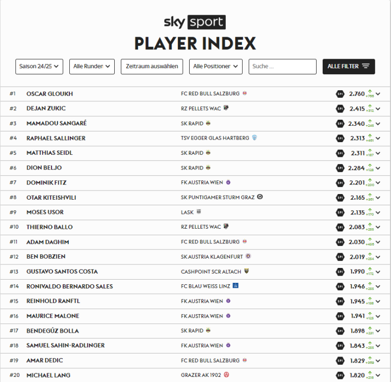 Runde 8 ist gespielt Liga 1 Tabelle: Wir haben einen neuen Spitzenreiter und der Name lautet @oldno7. Herzlichen Glückwunsch! In einem spannenden Duell gegen @MeisterAllerKlassen kommt @1 9 0 2 Graz nicht über ein Unentschieden hinaus und muss vorerst die Tabellenführung abgeben. @CantStopGrazerAK gibt mit dem ersten Saisonsieg die Rote Laterne an @Ouilexthekid ab. --------------------------------------------------------------------- Hier die Ergebnisse: @Philip1902 erreicht beachtliche 2147 Punkte. Damit scheitert er nur ganz knapp an der Saison-Bestmarke von @elmstein der weiterhin den Rekord hält mit 2197. Nächste Runde kommt es dann zum Spitzenspiel Tabellenerster gegen Tabellenzweiter! --------------------------------------------------------------------- Transferupdate: Seit letzten Mittwoch gab es nur wenig Veränderung bei den Teams. Den teuersten Einkauf leistete sich @Geidorfer mit Manfred Fischer für 3.9 Mio. Knapp dahinter folgt @CantStopGrazerAK mit Jakob Meierhofer für ca. 3.6 Mio. Ansonsten blieb es diesmal sehr ruhig am Transfermarkt ---------------------------------------------------------------------- Liga 2 Tabelle: In Liga 2 führt weiterhin @doncerebro die Tabelle an. Im Gegensatz zur vorherigen Runde konnte er die Tabellenführung um einen Punkt ausbauen. @Reddevil1977 klettert um 2 Plätze nach oben und @rottalgasse fällt nach einer Niederlage gegen Reddevil von Platz 3 auf Platz 6 zurück. ---------------------------------------------------------------------- Ergebnisse Spieltag 8: Das Team von @redskin mit einer enormen Leistungssteigerung zum Spiel davor. Letzte Runde gab es noch eine Niederlage mit 1192 erzielten Punkten und diese Runde konnte man den Wert fast verdoppeln. Mit sehr starken 2374 Punkten hat man @KeRe keine Chance gelassen. --------------------------------------------------------------------- Transferupdate: Mitverantwortlich für den Erfolg von @redskin war sicherlicher auch der Transfer von Szerencsi der von @Jumper kam und sich für das neue Vertrauen direkt mit 246 Punkten bedankt und damit auch seine Saisonbestleistung abgerufen hat. @Reddevil1977 setzt auf Konstanz und sichert sich die Dienste von Jonas Auer zum Preis von 3.825.000. @Auron1902 vertraut auf die Torjägerqualitäten von Romeo Vucic und legt für ihn 2.4 Mio auf den Tisch und @KeRe überlässt mir aus Mitleid oder Kalkül? Kristijan Dobras für etwas über 2.2 Mio da es in dieser Liga einen Mittelfeldspielermangel gibt. --------------------------------------------------------------------- Liga 3 Tabelle: Nach Spieltag 8 hieße der Tabellenführer weiterhin Grogi, da er aber gebannt wurde werde ich ab jetzt die Tabelle ab Platz 2 rechnen. Somit ist der aktuelle Tabellenführer @Exilgrazer, herzlichen Glückwunsch! @fulci & @bertl80 & @Moldi konnten ihre Tabellenplatzierung nach einem Sieg um 2 Plätze verbessern. ---------------------------------------------------------------------- Ergebnisse Spieltag 8: Eine Machtdemonstration gab es auch direkt vom frisch gebackenen Tabellenführer @Exilgrazer. Mit 2138 erzielten Punkten überschritt man klar die magische 2000er Marke und lässt @Reisinho diese Runde keine Chance auf einen Punktgewinn. Ansonsten alles recht eindeutige Ergebnisse und somit auch kein Unentschieden. Transferupdate: @johnny_knoxville gibt den Salzburger Innenverteidiger Capaldo für 4.5 Mio ab und holt sich im Gegenzug dazu Taferner für 4.2 Mio. @Moldi schnappt sich den fast GAK-Sommerneuzugang Otar Kiteishvili für etwas über 5.2 Mio. Ansonsten blieb es, in Punkto Transfers, sehr ruhig in Liga 3. ---------------------------------------------------------------------------------------------------------------------- Hier noch die Top 20 gemessen an Punkten: Ich glaub es ist eine Premiere, aber mit Michi Lang dürfte auch erstmalig ein GAK Spieler in den Top 20 zu finden sein. Ansonsten, danke an alle fürs mitmachen und weiterhin viel Glück!10 likes -