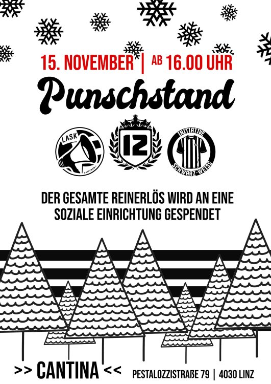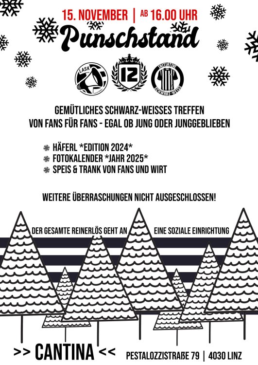 🖤🤍🖤🖤🤍🖤 - PUNSCHSTAND 2024 - 🖤🤍🖤🖤🤍🖤 Gerade befinden sich unsere Schwarz-Weißen noch in der Länderspielpause. Aber schon in der nächsten Länderspielpause (Mitte November) ist schon wieder Punschstand-Zeit. ‼️ - Save the Date - ‼️ Der alljährliche sehr beliebte Punschstand findet dieses Jahr am Freitag, den 15.11., ab 16.00 Uhr auf der Cantina -Terrasse statt (Pestalozzistraße 79, 4030 Linz). Gemeinsam mit Landstrassler und Initiative Schwarz-Weiss wird wieder ein gemütliches Beisammensein zelebriert und dazu auch noch gespendet. Alle sind dazu eingeladen.....egal ob jung oder junggeblieben. Neues Häferl, Fotokalender fürs neue Jahr, Punsch, Glühmost, Speis & Trank von Fans und unserem Lieblingswirt Erik und seinem Team......Fanartikel, Tombola..... Alles das und noch mehr erwartet euch an diesem Nachmittag/Abend. Kommt vorbei......gemeinsam eine schöne Zeit verbringen, dabei noch Gutes tun, denn der gesamte Reinerlös wird, wie schon in den Jahren davor, gespendet. Weitere und genauere Infos folgen in den nächsten Tagen/Wochen.17 likes