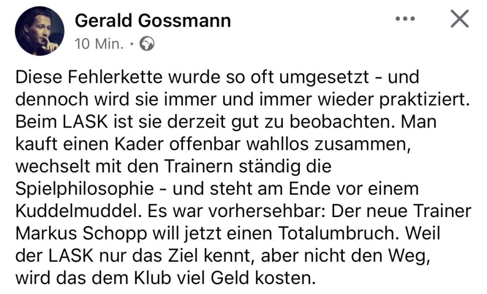 Persönlich schätze ich Gossmann sehr. Seine Beiträge sind fundiert und gut recherchiert, aber hier macht er es sich zu einfach. Die sich stetig ändernde Spielphilosophie mag zwar ein Mitgrund für die sportliche Talfahrt sein, ist aber definitiv nicht die Ursache. Die Herangehensweisen unter Sageder, Darasz und Schopp unterscheiden sich nur im Detail. Es ist eher das wahllose Verpflichten von selbsternannten „vielversprechenden Talenten“, die charakterlich und mentalitätsmäßig bereits vor 18 Monaten kaum in den bestehenden Kader passten, jedoch auf Grund der bestehenden Kaderstruktur nur zu einzelnen Rissen führte. Nach dem vergangenen Transfersommer wurden dem Kader in puncto Identifikation und Einstellung die letzten Eckpfeiler genommen und auf weitere Spieler auf einem sehr instabilen Fundament aufgebaut. Das Ergebnis ist ein Haufen an unzufriedenen Individualisten, die stellenweise die so dringend benötigte Qualität nicht mitbringen oder im Moment nicht im Stande sind diese abzurufen. Wichtige Säulen der vergangenen Jahre bauen von Monat zu Monat ab (Zulj, Ziereis, Horvath, Flecker), jüngere Spieler stagnieren in ihrer Entwicklung (Talovierov, Bello, Taoui, Ljubicic), andere plagen sich seit geraumer Zeit mit Verletzungen herum und finden sportlich keinen Anschluss (Renner, Mustapha, Ljubic) und zu guter letzt jener Pulk an Spielern die auf Grund fehlender Qualität nie beim LASK landen hätten dürfen (Berisha, Jovicic, Stojkovic, Tibidi, Pintor, Boateng, Tavares, Bogarde, Galvez)!10 likes -