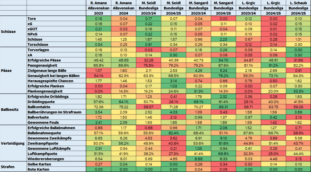 Ich hab mir (dank ChatGPT) nochmal die Statistiken von Amane aus den letzten 2 Saisonen im Vergleich zu unseren aktuellen Mittelfeldakteuren gezogen. Was auffällt: Seine Abschlusswerte sind sehr vergleichbar mit Matthias Seidl, leider auch dahingehend, dass sie in der letzten Saison deutlich schwächer waren als in der Saison davor. Seine Chancenkreation ist er ebenfalls auf einem guten Niveau, aber etwas schwächer als Seidl Seine Passquote ist sehr hoch (vergleichbar mit Sangaré & Grgic heuer), er spielt auch ähnlich viele Pässe Er spielt sehr wenige lange Pässe und kann das auch nicht sonderlich gut, ähnliches gilt für seine Flanken. Er dribbelt ähnlich oft & gut wie Sangaré, verliert den Ball aber öfter (jedoch seltener als Seidl & Schaub) Er zieht deutlich mehr Fouls als alle unsere bestehenden Spieler. Er führt & gewinnt mehr Zweikämpfe als unsere OMs, aber weniger als Sangaré. Für seine Größe ist er überraschend solide in der Luft Insgesamt sieht man auch da am Vergleich, dass er jetzt weder unser klassischer OM noch unser klassischer DM ist, aber sehr viele interessante Attribute hat.13 likes