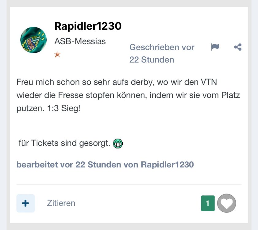 War von Anfang die falsche Botschaft meiner Meinung nach - wir reden oft dass es immer von den Medien etc. um Rapid geht und dann machen wir es selber genauso! Ich bin auch dagegen, dass ein Spiel ohne Gäste Fans stattfindet aber in einem Derby ist mir doch blunz egal ob die da sind oder nicht da gebe ich alles weil es eben ein Derby ist! (Und auch wenn keine Grünen Fans da sind bzw. ich die Brauch um auf Stimmung zu kommen sind ja noch immer 11 heiseln in grün am Feld und spielen - dann beschimpfe ich halt die, Pfeife die aus oder schreie für meine Mannschaft) Und wir haben fantechnisch sehr starke Wochen hinter uns aber heute war das vom aufwärmen beginnend bis in ganz seltenen Fällen rein gar Nix über 90 Minuten rein gar nix! Warum muss erst die nord “wer nicht hüpft der ist ein grüner” anstimmen in der zweiten Hälfte und plötzlich sieht man was im Stadion möglich wäre…Warum nutzen wir die Kraft von 15300 rein violetten im Stadion nicht aus, machen einen Feiertag draus mit Choreo, brachialer Stimmung und bereiten den Grünen die Hölle auf Erden…sehr enttäuschend heute für ein Derby!15 likes -