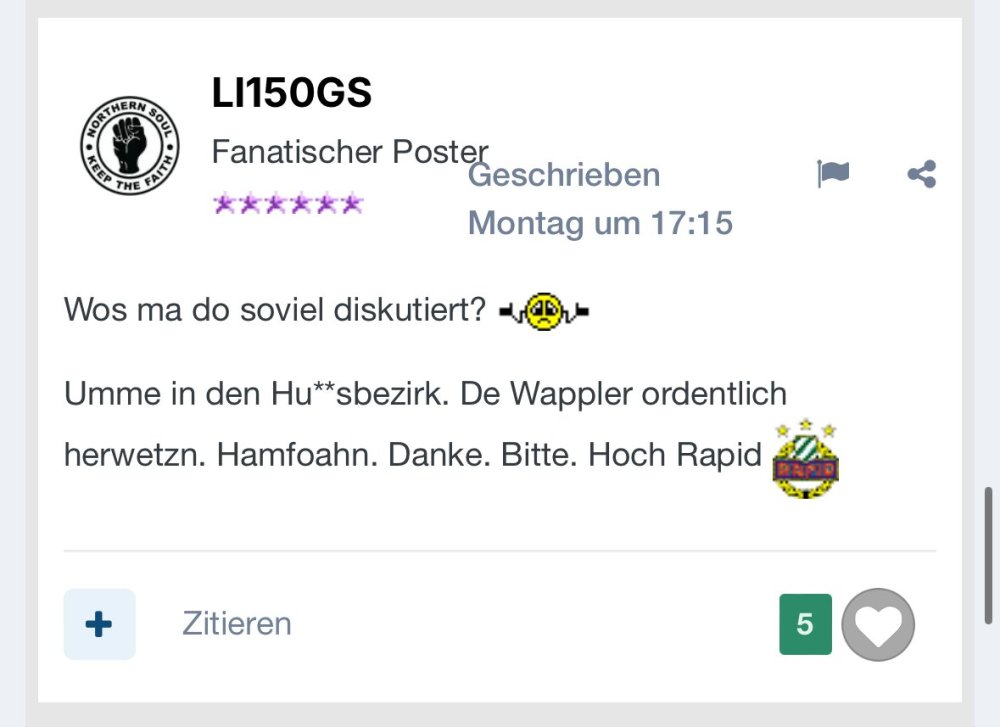 Das Beste vorab: 3 Punkte, Derbysieger und weiterhin ungeschlagen! Aus meiner Sicht eine der schwächsten Leistungen der letzten Spiele, Rapid überraschend gut begonnen und wenn Beljo nicht das 2:0 verhindert wäre es vermutlich extrem schwer geworden, so ehrlich muss man sein. Überraschend oder auch enttäuschend, dass die Ost heute die Chance verpasst hat aus dem heutigen Tag ein Fussballfest zu machen. Fast die meiste Zeit mit Protestplakaten zu vergeuden bzw. die Banner am Kopf stehend zu präsentieren war keine gute Entscheidung, die Spieler hätten sich mehr verdient gehabt. Dafür heute erstmals halbwegs vernünftige Stimmung auf der Nord😉. Jetzt nächste Woche die Bullen schlagen und als Fans wieder richtig supporten und dann ist vieles möglich. Abschließend noch ein Extralob an Dragovic, unfassbar was der auf dem Platz lässt, Einsatz, Mentalität aber auch gute Pässe, er ist der Hauptgrund für unsere stabile Defensive.33 likes