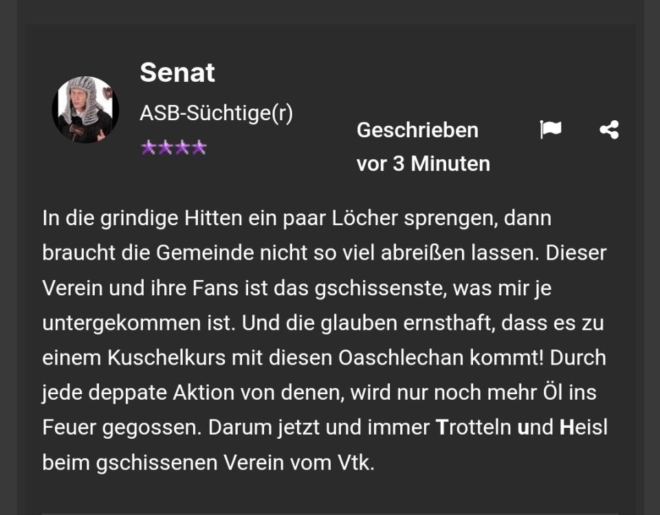 Ja gästefans sollten dabei sein, aber genau den Punkt kann ich nicht ganz nachvollziehen warum dann bei einem Derby keine Emotionen dabei sind - der Erzrivale ist da, es spielen 11 vollheisel in grün am Feld (darunter so Patienten wie ein Hedl, grigic usw.) Dann „bearbeite“ ich doch die, Pfeife sie aus, nutze das zu meinem Vorteil dass sie nur violett hören damit die schon mit einem beistrich in der Hose zum aufwärmen kommen und merken heute geht’s 90 Minuten nicht nur gegen 11 Mann sondern gegen 12, 13, 14 auf den Rängen! Und ich trau mich wetten, die Grünen machen genau das in ihren 2 heimderbies gegen uns - da denkt keiner „ach, schade dass die away Fans heute nicht da sind, drum ist es kein echtes Derby“ usw! Wir selber haben sie gestern zum Thema gemacht anstatt dass wir das nutzen und sie auf den Rängen niedersingen, niederpfeifen usw.12 likes -