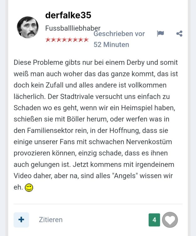Weil hier ja doch noch recht viel gerechtfertigt wird wo es nix zu rechtfertigen gibt egal wer "angefangen" hat: Verroht, verblödet, verloren. In über drei Jahrzehnten auf diesem Planeten habe ich es kein einziges Mal geschafft, mit der Polizei Probleme zu haben. Warum? Weil ich nicht auf die grandiose Idee komme, mich wie ein Höhlenmensch auf Crack zu benehmen. Doch gewisse Individuen im Rapid-Block haben das Prinzip „Ursache und Wirkung“ bis heute nicht kapiert. Da wird gepöbelt, randaliert, demoliert – und wenn die Polizei eingreift? Mimimi, Polizeigewalt! Wie immer. Schaut euch die Bilder an: Stühle, Türen, brennende Fackeln fliegen durch die Luft – wegen einem Fußballspiel. Einem verdammten Spiel, bei dem Männer in kurzen Hosen einen Ball treten. Wer das mit Gewalt beantwortet, gehört nicht ins Stadion, sondern in die geschlossene Abteilung. Dummheit schützt vor Strafe nicht – und vor der eigenen Lächerlichkeit schon gar nicht.22 likes -
