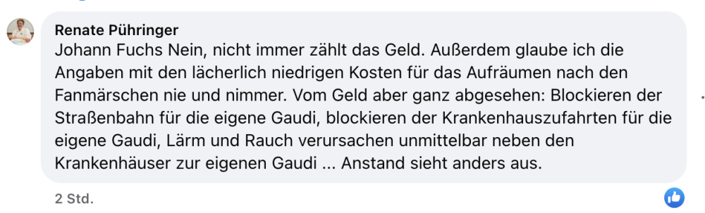 Was dieser Mann tatsächlich und rechtlich nicht versteht: Beim City Night Run zahlen 3000 Leute im Durchschnitt € 25,- für eine gewinnorientierte Veranstaltung. Das sind in etwa € 75.000,- insgesamt, also ca. 10% für Polizei und Reinigung. Ein Marsch von Fans hingegen manifestiert nur ihre gemeinsame Liebe zum Verein und zum Fußball, ohne dabei eine Gewinnabsicht zu verfolgen. In Linz gesittet wie nie zuvor. Es fällt mir wirklich schwer diesen Quatsch zu lesen und mir diesen Antrag und die Diskussion anzuhören. Da brauchst kein Fußballfan sein, damit klar wird, dass diese Rechnung so nicht aufgeht. Verfassungsrechtlich garantierte Freiheitsrechte aufweichen - in Linz sogar ohne Anlass. Ich find ja seine Bestrebungen unsere Stadt vom Müll zu befreien richtig toll, vielleicht wieder mehr Zeit damit verbringen, anstatt Müll zu verbreiten? Zur eigenen Gaudi auch ein wenig mitgehen Müllsammeln liebe Renate? Tief und anständig Luft holen in der Natur, die Ruhe genießen, innere Blockaden abbauen, Rauch und Lärm der Stadt hinter dir lassen..9 likes -