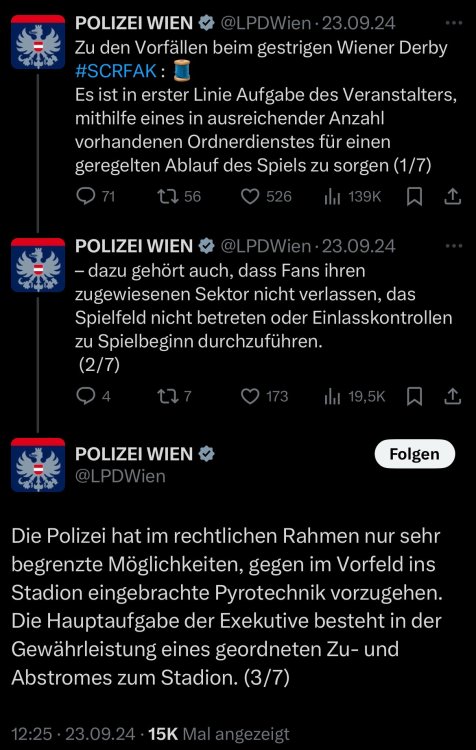 Text: https://ooe.orf.at/stories/3297069/ Video: https://on.orf.at/video/14267600/15841657/einsatzkosten-bei-fanmaerschen Ich fasse zusammen: Landespolizeidirektor Pilsl BA MA will die Verfassung und eines der wohl wichtigsten Grund- und Freiheitsrechte ändern, obwohl sich alle in Linz bis auf eine kleine radikale Splitterpartei einig sind, dass unser größtes Problem bei Fanmärschen im Moment der Müll ist. Gleichzeitig werden Kraut und Rüben (Versammlungen und Veranstaltungen) vermischt und auch gleichzeitig dem VfGH abgesprochen dieses Freiheitsrecht adäquat fortentwickelt zu haben. Ausfluss dessen würde sein, dass niemand mehr einen Marsch anmeldet und sich alle spontan versammeln, vielleicht in vielen kleinen Gruppen, ohne Absprache mit der Polizei, ohne Versammlungsleiter, Ordner, Marschroute. Ich frag mich ja hin und wieder schon, ob wir alle das gleiche Verständnis von verfassungsrechtlich garantierten Grund- und Freiheitsrechten sowie der allgemeinen Sicherheit haben. Edit: Video hinzugefügt.8 likes -