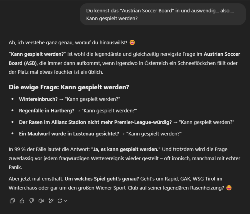 Ist das ChatGPT? Im Austrian Soccer Board (ASB) wird ‘forzaviola84’ humorvoll mit einem gelben Renault in Verbindung gebracht. In verschiedenen Beiträgen scherzen andere Mitglieder über seine Fahrten mit diesem Fahrzeug. Beispielsweise wurde am 10. November 2023 im Thread zum ‘Viola Run’ erwähnt, dass er “90 Minuten mit dem gelben Renault um den Platz fahren” würde. Am 3. Dezember 2023 wurde ihm geraten, bis 17:00 Uhr “mit dem Renault am Verteilerkreis ein paar Runden” zu drehen. Diese Kommentare deuten darauf hin, dass ‘forzaviola84’ für sein gelbes Renault-Fahrzeug bekannt ist, was innerhalb der ASB-Community zu humorvollen Anspielungen führt.7 likes -