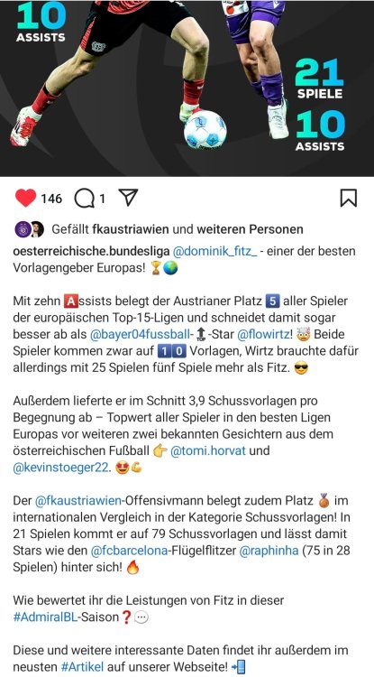 Auer ist auch so ein typischer Fall wie früher Schwab wo eigentlich jedem klar sein sollte, dass er ein absoluter Leistungsträger ist, aber die eigenen Fans irrational einen Sündenbock aus ihm machen - und ja, ich glaub auch, dass er schon bessere Phasen hatte. Und ja, ich hab mich im Derby auch über ihn geärgert. Aber defacto (und bei allen Unzulänglichkeiten eines Algorithmus) ist er auf Sofascore mit einer durchschnittlichen Bewertung von 7.22 der beste LV der Liga und der beste Rapid Spieler heuer. Manchmal erkennt man dann erst wieder was man hatte, wenn man es nimmer hat. MMn aber als Prass Ersatz die vollkommen logische Wahl. Bei Lazaro kann man noch diskutieren, hat zumindest auch schon LV gespielt heuer, aber halt in einer 5er Kette. Aber Schnegg, Ullmann, Pfeifer, … - da nehm ich allemal Auer. Wüsste nicht auf welcher statistischen Basis man das anders sehen sollte. Und btw. Glückwunsch zur Nominierung! Ich glaub nach wie vor, dass das einem Spieler grundsätzlich nur weiterbringt.27 likes