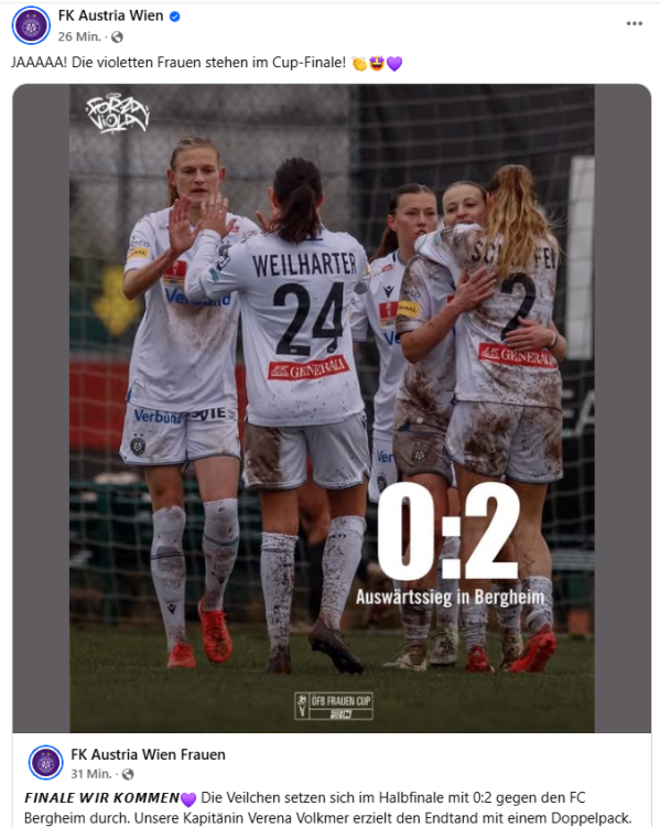 Unsere Damen stehen im ÖFB Cupfinale, das lt. ÖFB-Hompage (Zugriff29.03,16:26) am 24. Mai um 14:00 Uhr in Wiener Neustadt gespielt wird. Am 24. Mai spielen unsere Herren das letzte MS-Spiel gegen BW Linz zu Hause um 17:00 Uhr. Ich möchte bei beiden Spielen live dabeisein. Deshalb fordere ich die Zuständigen der Austria auf, im Sinne einer Verlegung des Cupfinales aktiv zu werden.15 likes