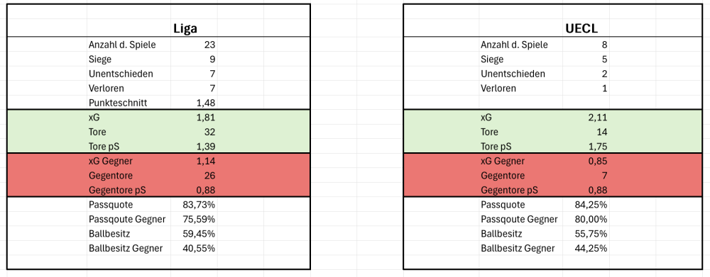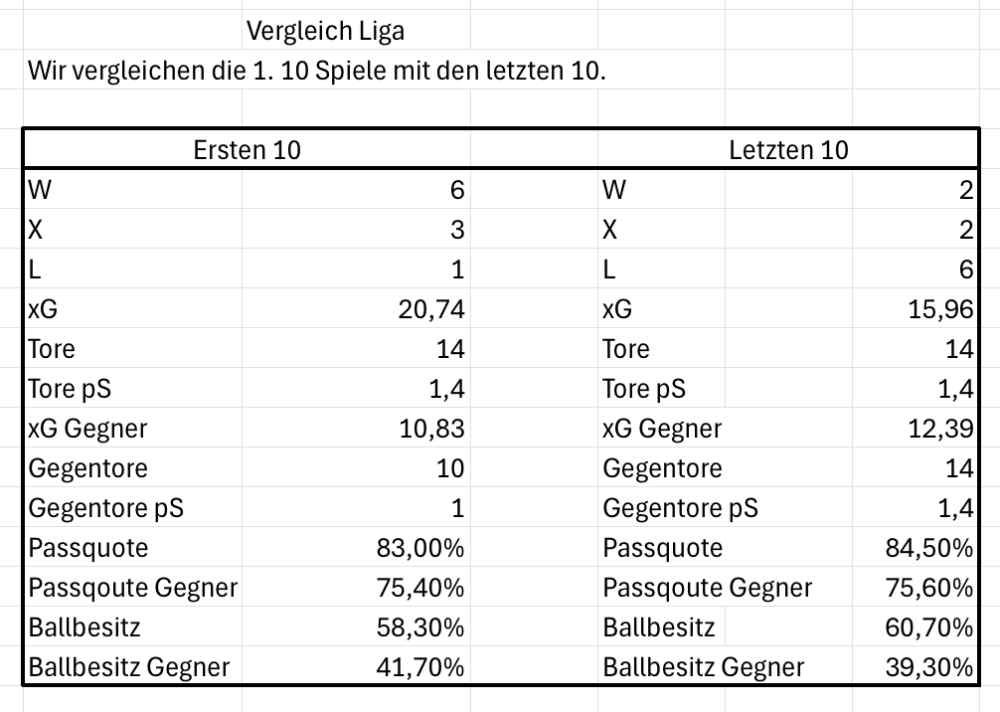 Ein paar Zahlen und Fakten für die Statistiker unter euch: Man sieht gut, dass unser xG Wert massiv eingebrochen ist, der des Gegners jedoch leicht zugenommen hat. Man versucht anscheinend noch mehr Ballbesitz zu generieren, damit der Gegner gar nicht Momente vorfinden kann Tore zu schießen - was jedoch komplett in die Hose geht. Wir haben eine höhere Passquote und mehr Ballbesitz als in den ersten 10 Spielen - jedoch nur 8 Punkte. Zum Vergleich 21 aus den ersten 10 Spielen. Die 2 Ausschläge gegen Ende waren GAK und Altach. Diese drücken den Durchschnitts-xG Wert der letzten 10 Liga-Spiele nochmal ordentlich nach oben. Von gespielten 23 Spielen haben wir nur 9 gewonnen - und das obwohl wir in 15(!) Partien den höheren xG Wert hatten. Zum Form Vergleich: In den ersten 10 Spielen hatten wir 8 mal den höheren xG Wert und fuhren 6 Siege und 3 X ein. In den letzten 10 Spielen hatten wir 4 mal den höheren xG Wert und fuhren 2 Siege und 2 X ein. Auch da sieht man einen erheblichen Rückschritt. Wenn man die Leistungen in der Liga mit der im UECL vergleichen will: Wir haben Overall grundsätzlich mehr Ballbesitz und und die bessere Passquote als der Gegner. Wir haben sogar eher den höheren xG Wert als der Gegner. Aber 1. machen wir oft nix draus (sieht man allein am xG-Wert / tatsächlich geschossene Tore Vergleich) und 2. nimmt dieser sogar zusehends ab. Die "Räder" die gedreht wurden, waren eindeutig die falschen. Spieler werden stur so eingesetzt wie man erhofft das es dem System dient. Sieht man ganz stark am massiven Leistungsabfall bestimmter Spieler. Der verfolgte Plan von Klauß funktioniert, so wie er derzeit vorgesehen ist, nicht. Und da sind auch nicht plötzlich alle Spieler schuld, denn es hat schon funktioniert... und außerdem sind das Roberts Spieler. Es gab genügend Transferfenster. Punkt um.23 likes