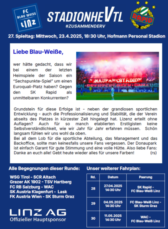 Find die Trainerdiskussion zum jetzigen Zeitpunkt total entbehrlich. Jetzt Klauss in Frage zu stellen... dachte sowas gibts nur beim LASK. Ja, es ist in dieser Saison nicht rund gelaufen. Aber das wäre auch der Fall, wenn Sangare und Hedl in den letzten Spielen nicht Rot gesehen hätten und wir in der Folge vllt beiden Spiele gewonnen hätten. Das würde an meiner Beurteilung des Trainers nichts ändern - aber es würde dann mit Sicherheit keine Diskussion geben. Die einzig richtige Entscheidung kann es sein, diese Saison zuende zu spielen und in den Wochen danach die Arbeit des Trainerteams in den letzten 1,5 Jahren zu analysieren. Wenn man dann meint, es braucht einen Neustart - um den gefühlt 20 Neustart in den letzten 19 Jahren auszubügeln, dann soll es so sein.. Aber JETZT wäre es ein Riesenfehler und würde unsere Chancen auf einen internationalen Bewerb und eine geordnete (allfällige) Übergabe auf einen neuen Trainer im Sommer in meinen Augen massiv reduzieren. Ein Raussschmiss jetzt wäre für mich der Beweis, dass wir auch unter Katzer weiterwurschteln wie die letzten 15 Jahre!19 likes