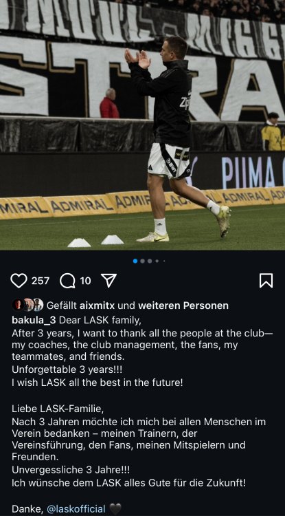 Nach seiner schweren Verletzung dann nochmals 4 Tore (gegen die Austria, Red Bull, Sturm und LASK) in den letzten 5 Bewerbspielen zu machen ist einfach nur sensationell. Sein letzter Ballkontakt dann noch der Assist zum entscheidenden Tor gestern. So ein Abgang ist purer Wahnsinn....und absolut seiner würdig!19 likes