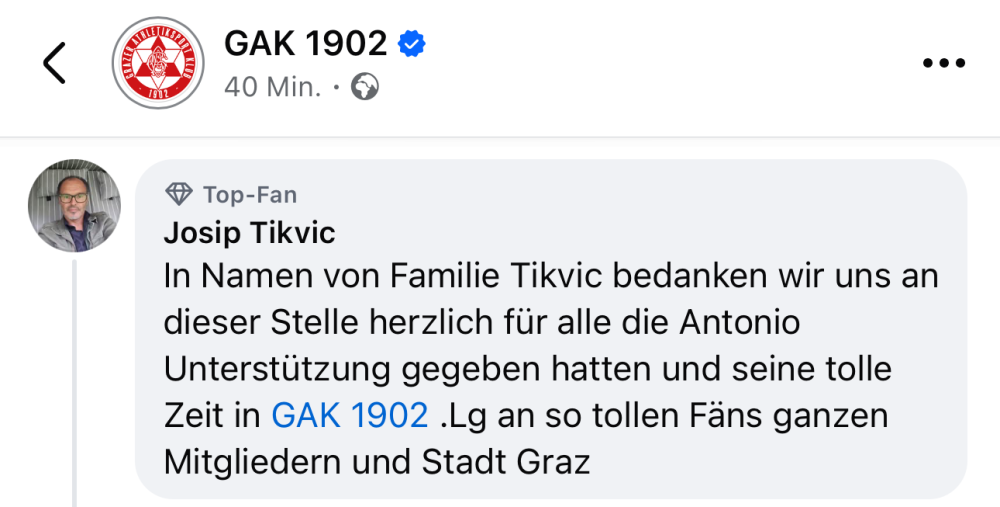 Hatte immer das Gefühl Tikvic hat sich mit dem Verein identifiziert. Zeigen auch die Postings. Nach dem letzten Auswärtsspiel gegen Rapid (0:3 mit Poms) war er der Erste der Richtung Auswärtsblock zugesteuert ist. Sein gestikulieren hat für mich wie eine „Entschuldigung“ gewirkt. Bei ihm hatte ich das Gefühl das ihm der Auftritt peinlich war. So kams mir halt vor und fand ich klasse. Schade, dass er geht.16 likes -
