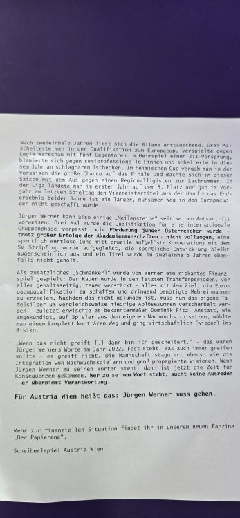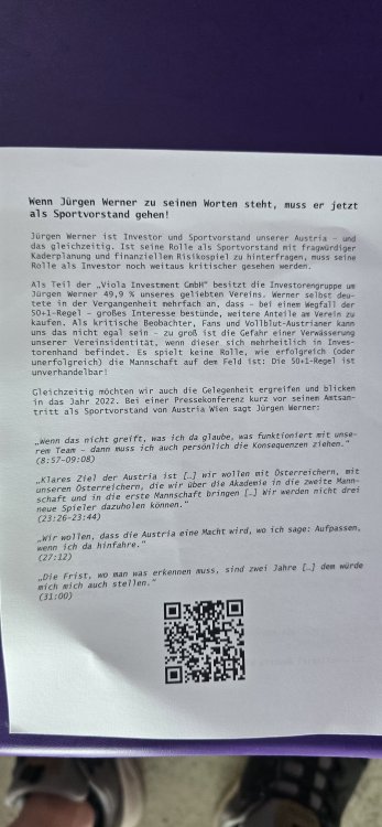 Grande von der Szene heute, genau mein Geschmack. 1) Flyer mit klaren Botschaften, ohne Populismus oder Rant, einfach ein "beim Wort nehmen". On-Point und genau das Richtige. 2) Support der Mannschaft, auch wenn es wirklich hart war und die Mitmach-Quote nicht gut war (ich nehme mich da nicht aus, mir hat es auch gereicht). 3) Klare Botschaften der Unmutsäußerung an den Vorstand - nicht aber an den Trainer oder die Mannschaft. 4) Ab ca. Minute 80 eine "scheiß drauf" Mentalität und "Austria ist der beste Klub der Welt", mit tanzen und springen auf Ost-2 (was unten war weiß ich nicht). 5) Mannschaft kommt und wird mit einem knappen "bitte geht's" in einer nie dagewesenen aber unvulgären und nicht aggressiven Weise in die Kabine geschickt. Punktegenau! Danke an KAI und alle drum herum, denn so geht Szene! Gibt wieder einen bunten Schein für die Box!19 likes -