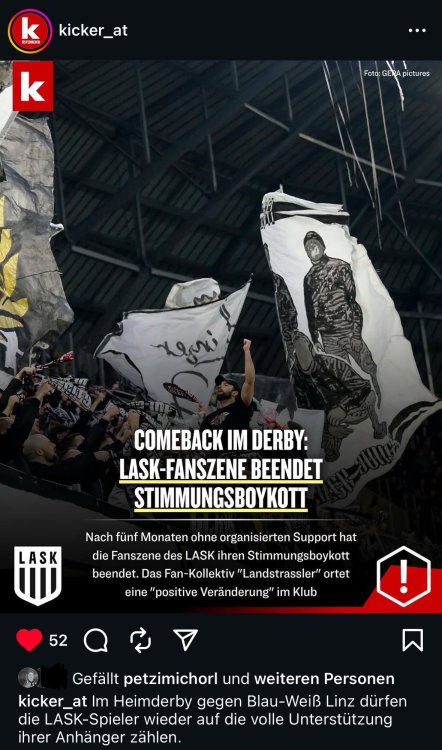 Die letzten Monate waren für keinen LASK-Fan leicht. Ab sofort liegt es an uns allen, wieder geeint aufzutreten und in der schwierigen sportlichen Situation die Mannschaft bestmöglich zu unterstützen. Lassen wir jegliche Ressentiments vor den Stadiontoren und schaffen wir gemeinsam mit voller Wucht im Stadion den Umschwung!9 likes -