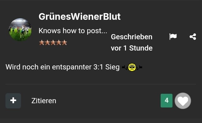 Danke an die Mannschaft, was für ein verdienter Derbysieg und ich muss nach dem heutigen Spiel etwas los werden . Ich werde zukünftig nicht mehr über den Trainer, die Mannschaft oder den Verein schimpfen und mich auslassen auf eine Art und Weise die unter der Gürtellinie geht. Kritik ja, aber zukünftig nievauvoll, auch ich bin in meinem Alter noch lernfähig ... Zum Spiel, unglaubliche Leistung gegen den angeblich stärksten Kader in der Liga .Austria in den 90 Minuten die weit bessere Mannschaft, Rapid erschreckend harmlos, ungefährlich und in vielen Situationen sehr unsportlich .... STOLZ BEIM RICHTIGEN VEREIN ZU SEIN!!!!24 likes