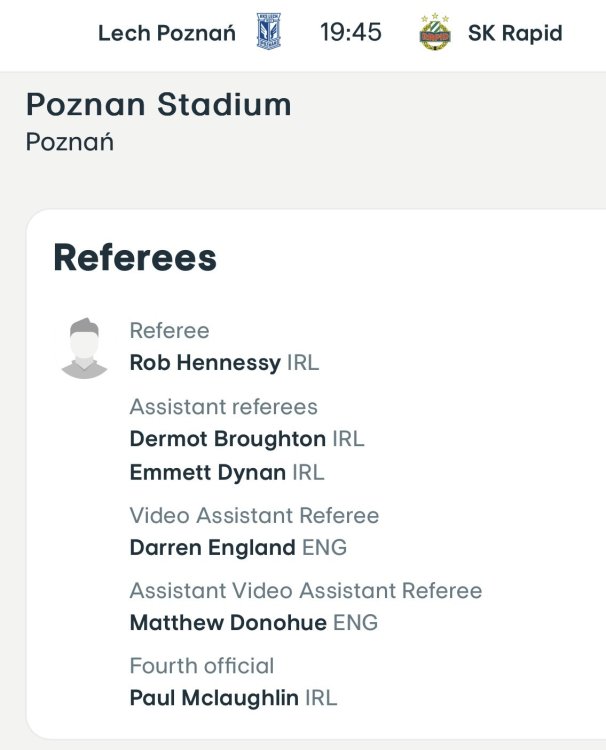 Apologies in advance. UEFA have sent one of our worst referees for this Conference game. In Ireland, we find it amazing how these guys can get to be a referee in top level European games. He is known in the League of Ireland as “Random Rob” because he takes cards out when he feels like it, and he is not quite sure about the offside rule. Sorry about this. I hope Rapid can carefully navigate past Lech and this guy. Best wishes and Good Luck tomorrow.9 likes