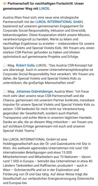 Da muss man noch einmal Danke sagen, dass der WTFAK mit Steuergeldern vor einer Nähe zu Orban gerettet wurde. Lukoil und Putin sind da definitiv die richtige Variante. Erfolgreiche Arbeit der Marke "Stadt Wien"18 likes