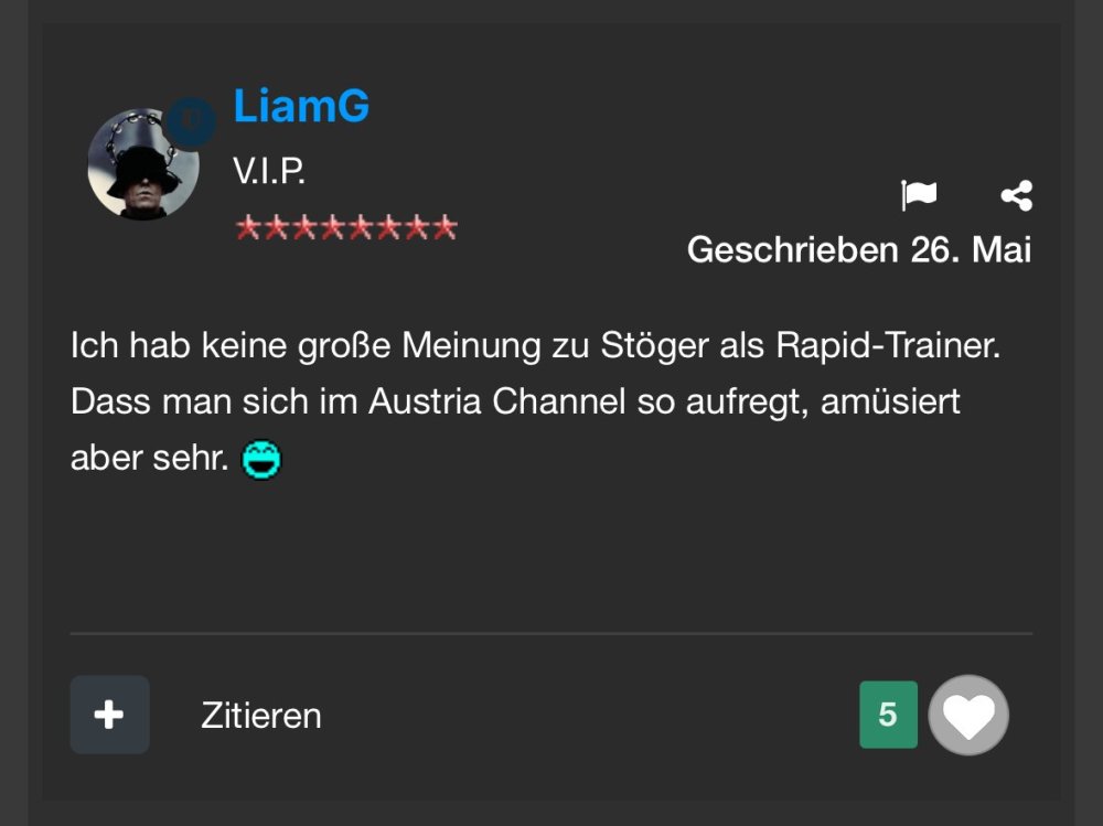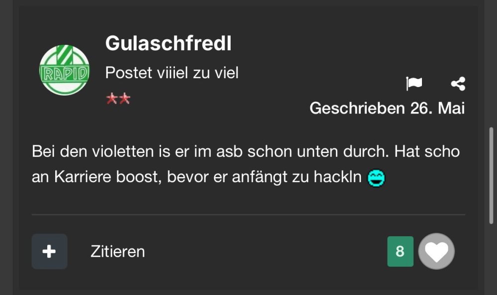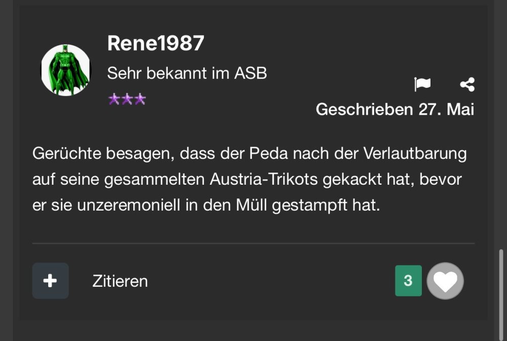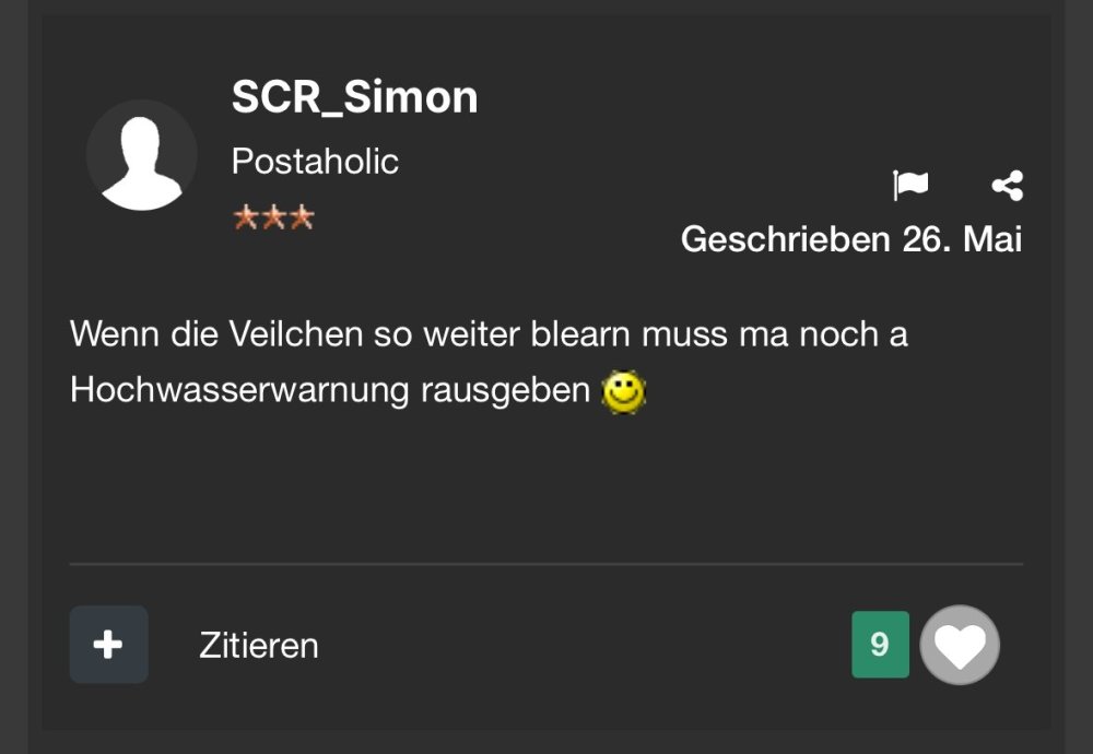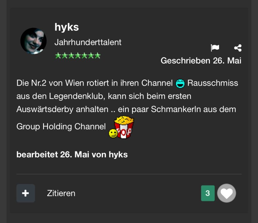 die hat da was losgetreten. wobei der oberhammer wäre ja. derbyheimsieg im kommenden derby und im stadion spielens "Kränk di net" ein mehr kannst die dann nicht mehr demoralisieren14 likes -