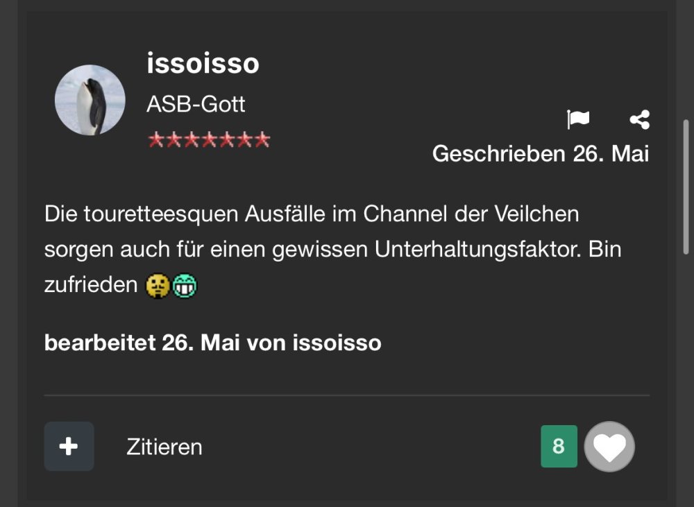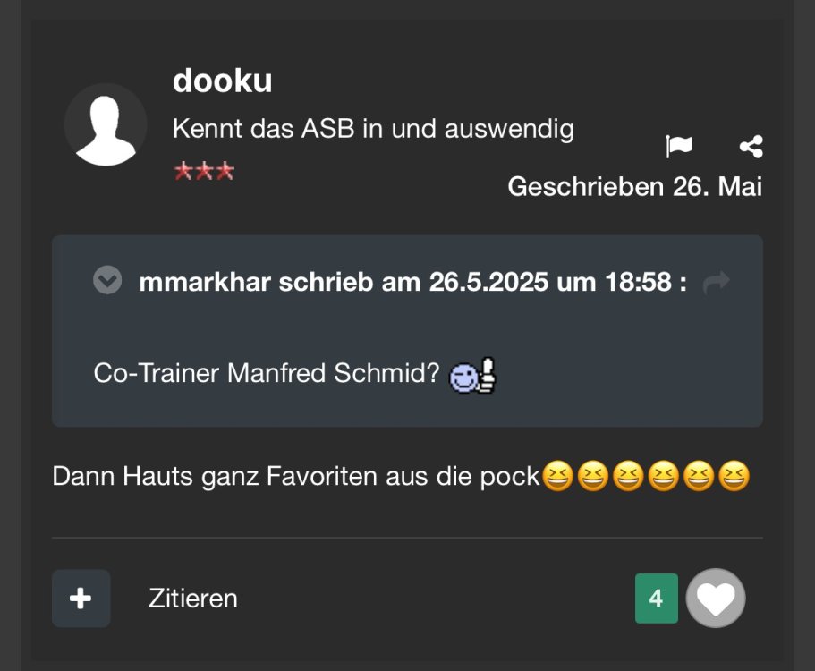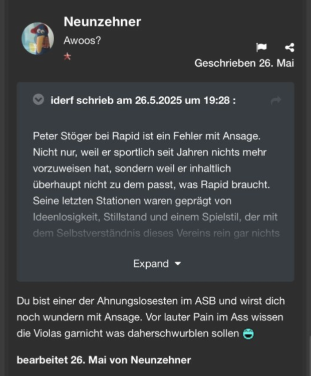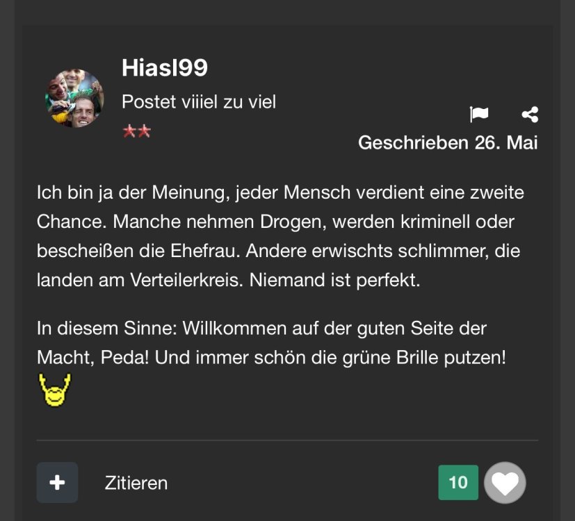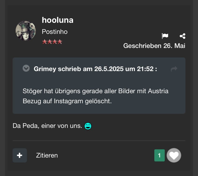 die hat da was losgetreten. wobei der oberhammer wäre ja. derbyheimsieg im kommenden derby und im stadion spielens "Kränk di net" ein mehr kannst die dann nicht mehr demoralisieren14 likes -