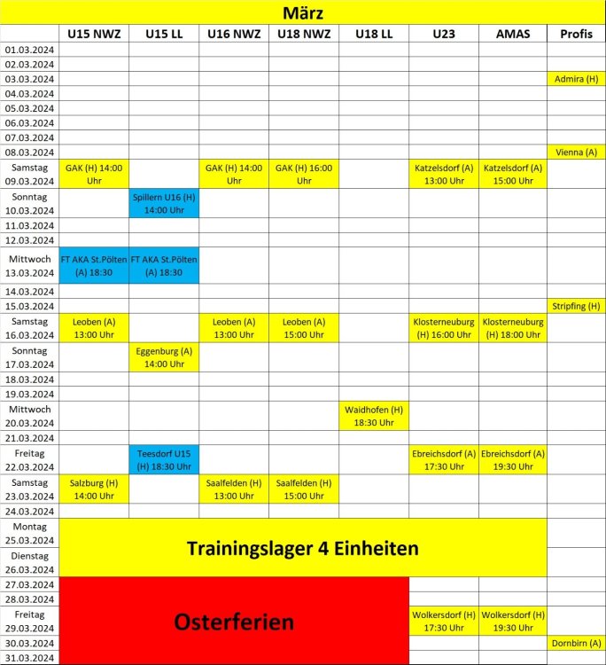 Kurze Erhänzung: die U17, die sich hauptsächlich aus U16 Spielern und Spielern aus dem Reservekader zusammensetzt, ist in der Landesliga nach Verlustpunkten gleichauf mit dem Tabellenführer SKN St. Pölten Zweiter. Übermorgen Mittwoch gibt’s dann das Spitzenspiel (in St. Pölten)